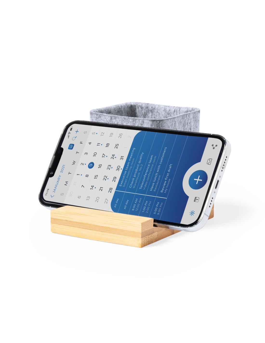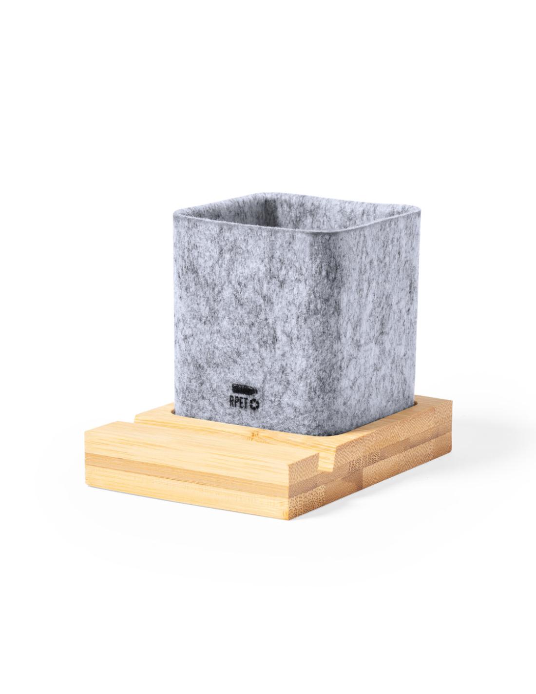 Lapicero de línea nature fabricado en fieltro RPET, con soporte para smartphone en bambú. Con distintivo fieltro RPET y presentado en caja individual de diseño kraft.El fieltro RPET reciclado es fruto de la combinación del proceso de reciclaje de materiales plásticos junto con la técnica milenaria de fabricación del fieltro, dando como resultado un material de eco-tendencia que, además de ser de origen reciclado, también se convierte en reciclable.