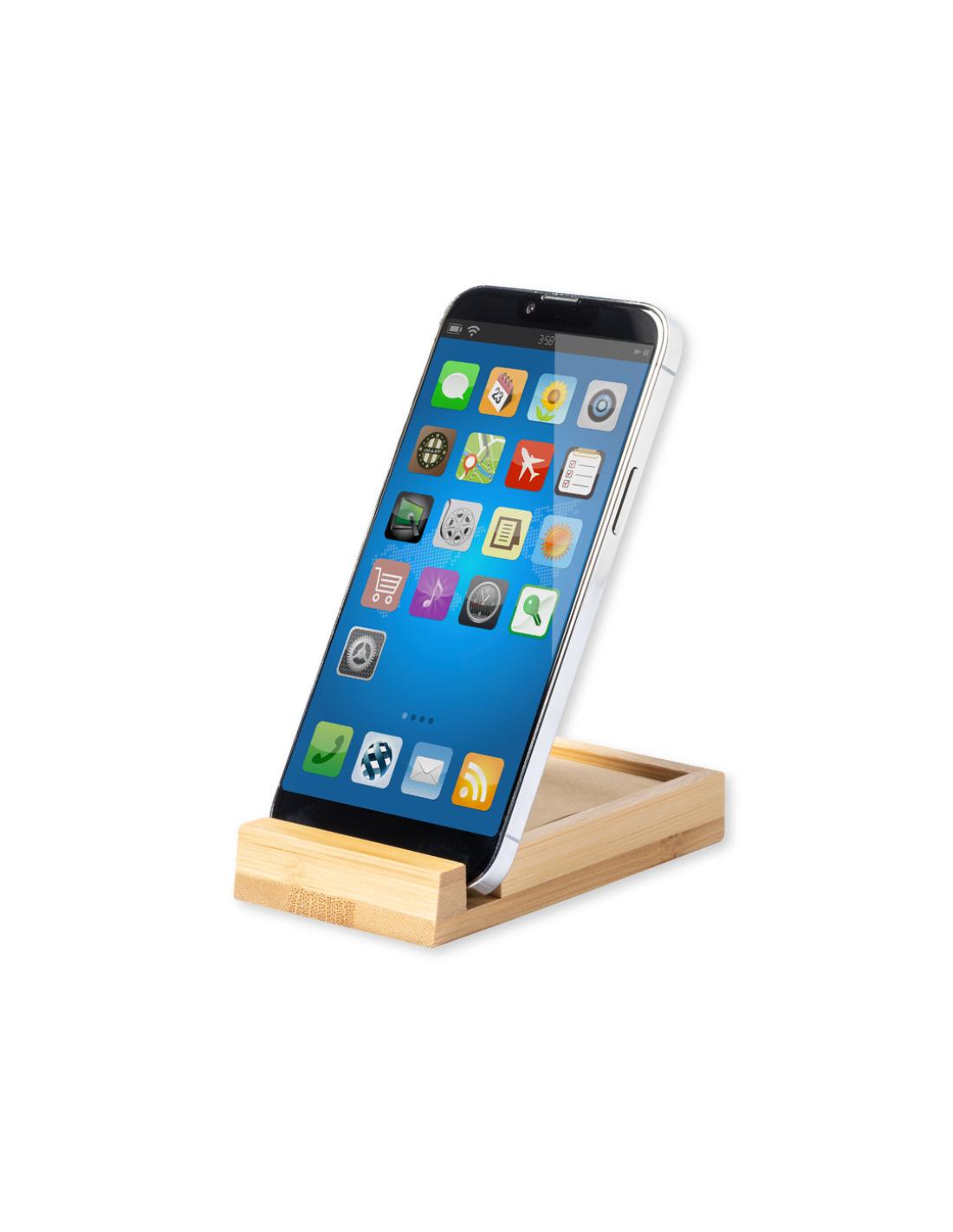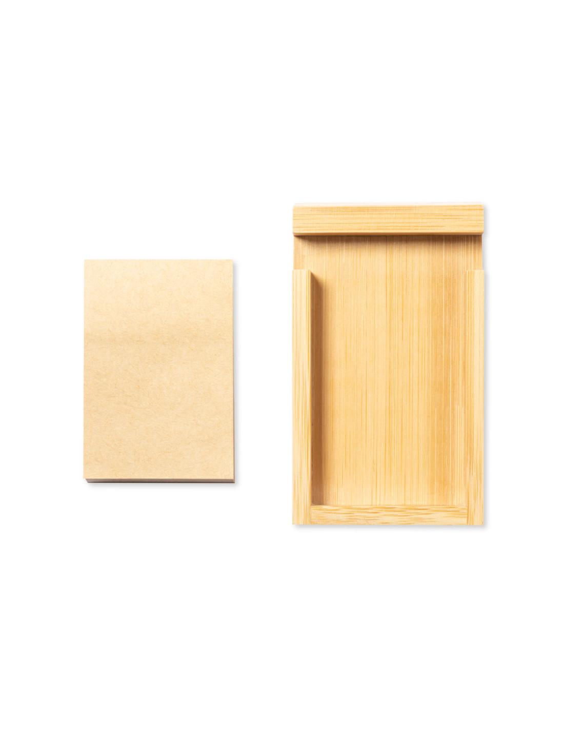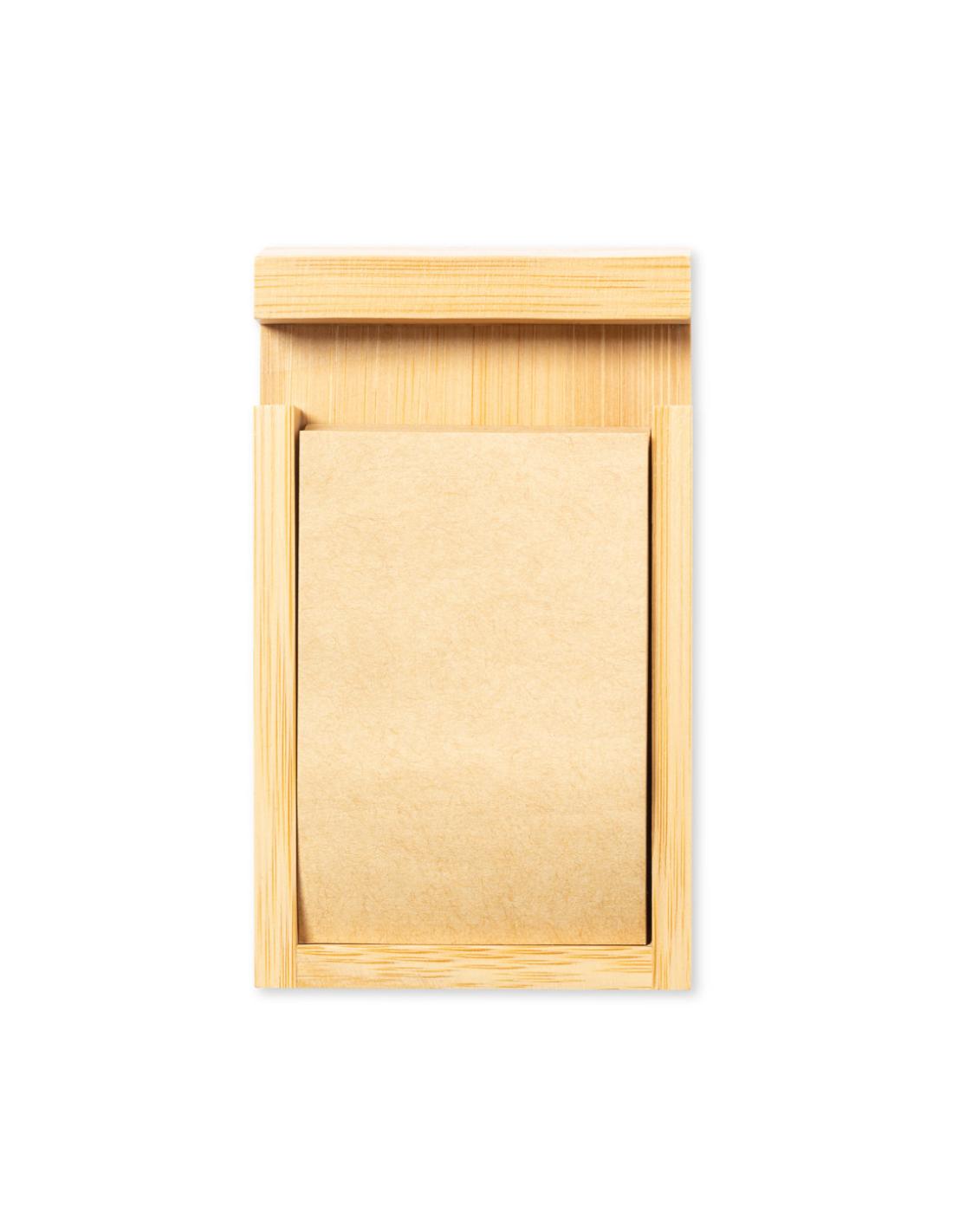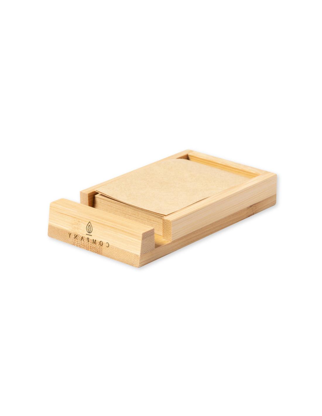 Portanotas de línea nature con soporte para smartphone integrado. Fabricado en bambú, incluye 80 notas adhesivas de acabado kraft. Presentado en caja individual de diseño kraft.