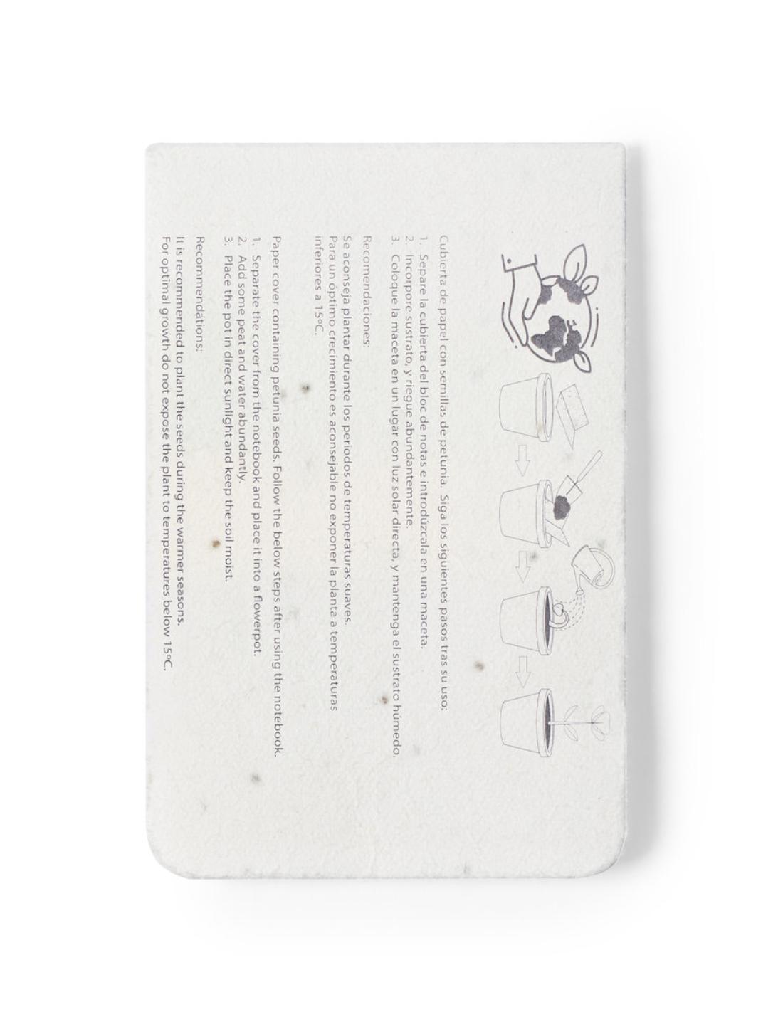 Bloc de notas de línea nature, con cubiertas fabricadas en papel semilla, reciclable y degradable. Incluye semillas de petunia en ambas cubiertas, convirtiéndolo así en papel plantable al final de su vida útil. Interior con 10 notas adhesivas medianas y 30 mininotas adhesivas en varios colores. Flores en colores surtidos, con instrucciones de plantado en la cubierta trasera y presentado en bolsa individual de papel reciclado.