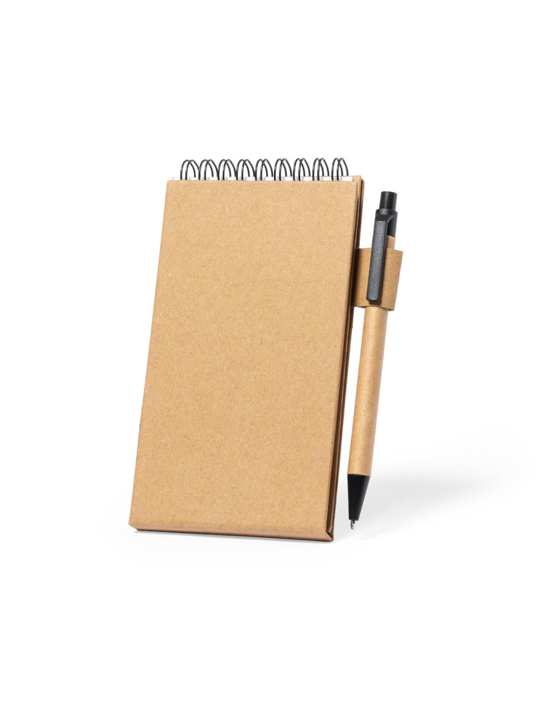 Bloc de notas de línea nature convertible en soporte para smartphone y fabricado en cartón reciclado. Incluye: Bloc de anillas de 30 hojas blancas, con disposición a una raya y soporte para bolígrafo. Bolígrafo en cartón reciclado con detalles en negro, de mecanismo pulsador y en tinta azul.25 notas adhesivas medianas.125 mininotas adhesivas en varios colores.
