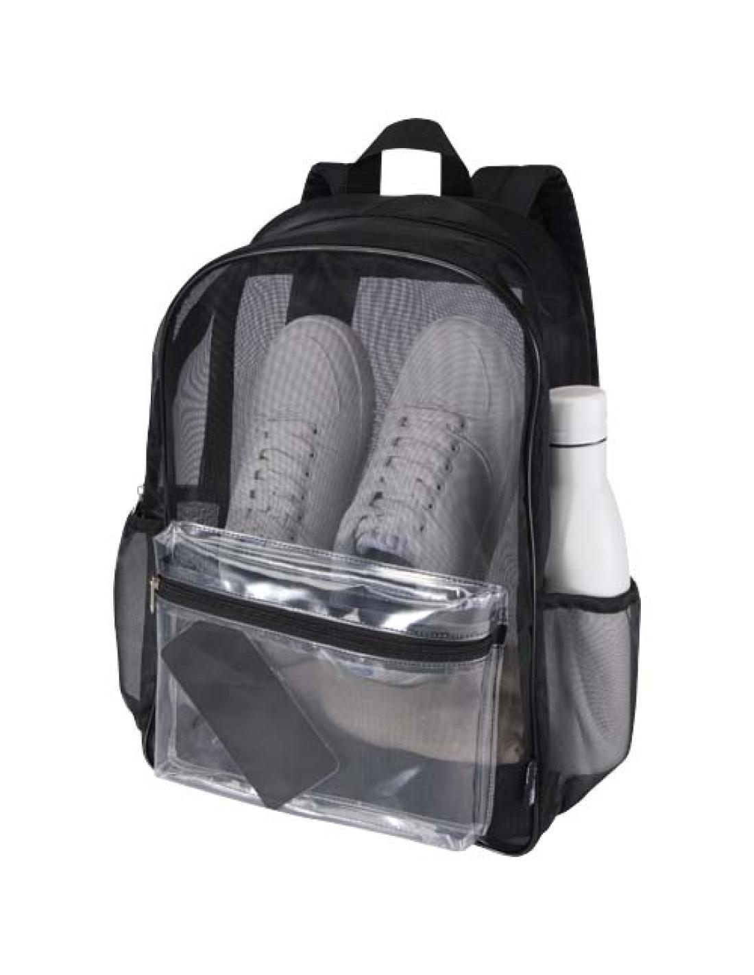 Fabricada con malla de poliéster reciclado, esta mochila ofrece una opción más sostenible sin renunciar a la practicidad ni al estilo. Dispone de un generoso compartimento principal de 18 litros para los artículos de uso diario, un bolsillo frontal con cremallera para los objetos más pequeños y dos bolsillos laterales ideales para una cantimplora o un paraguas. Las correas acolchadas y ajustables garantizan un transporte cómodo durante todo el día. La construcción de malla transparente crea un aspecto elegante y contemporáneo y permite una clara visibilidad del contenido, lo que la hace perfecta para el trabajo, eventos o colegios con políticas de bolsas transparentes.