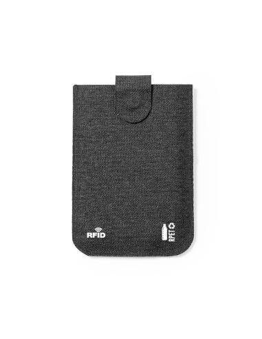 Elegante tarjetero fabricado en poliéster RPET de acabado en color negro. Con cierre imantado, capacidad para 5 tarjetas y mecanismo de extracción tirando de la cinta de cierre. Con tecnología de seguridad RFID (Identificación por Radio Frecuencia) que mantiene seguros tus dispositivos de transmisión de identidad. Distintivos RPET y RFID en el exterior. El material RPET se elabora a partir de plástico reciclado, para así fomentar la reutilización de residuos plásticos y ayudar a la sostenibilidad del planeta.