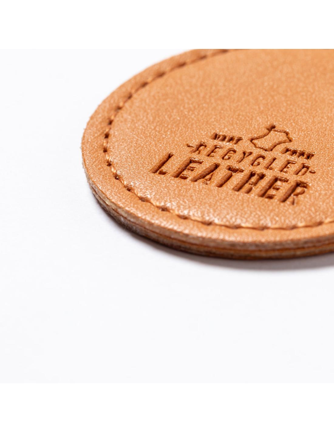 Llavero de línea nature fabricado en cuero reciclado. En tono marrón, con diseño circular y de acabado cosido. Grabado con distintivo cuero reciclado en una cara, con lado opuesto liso para impresión. Anilla metálica cromada y presentado en bolsa individual kraft.El cuero reciclado rescata las fibras desechadas en los procesos de fabricación del cuero, minimizando el desperdicio de material, contribuyendo a reducir el impacto ambiental y manteniendo a la vez sus propiedades originales.