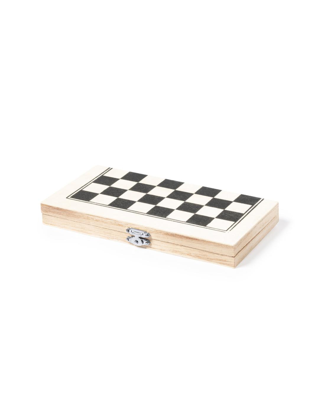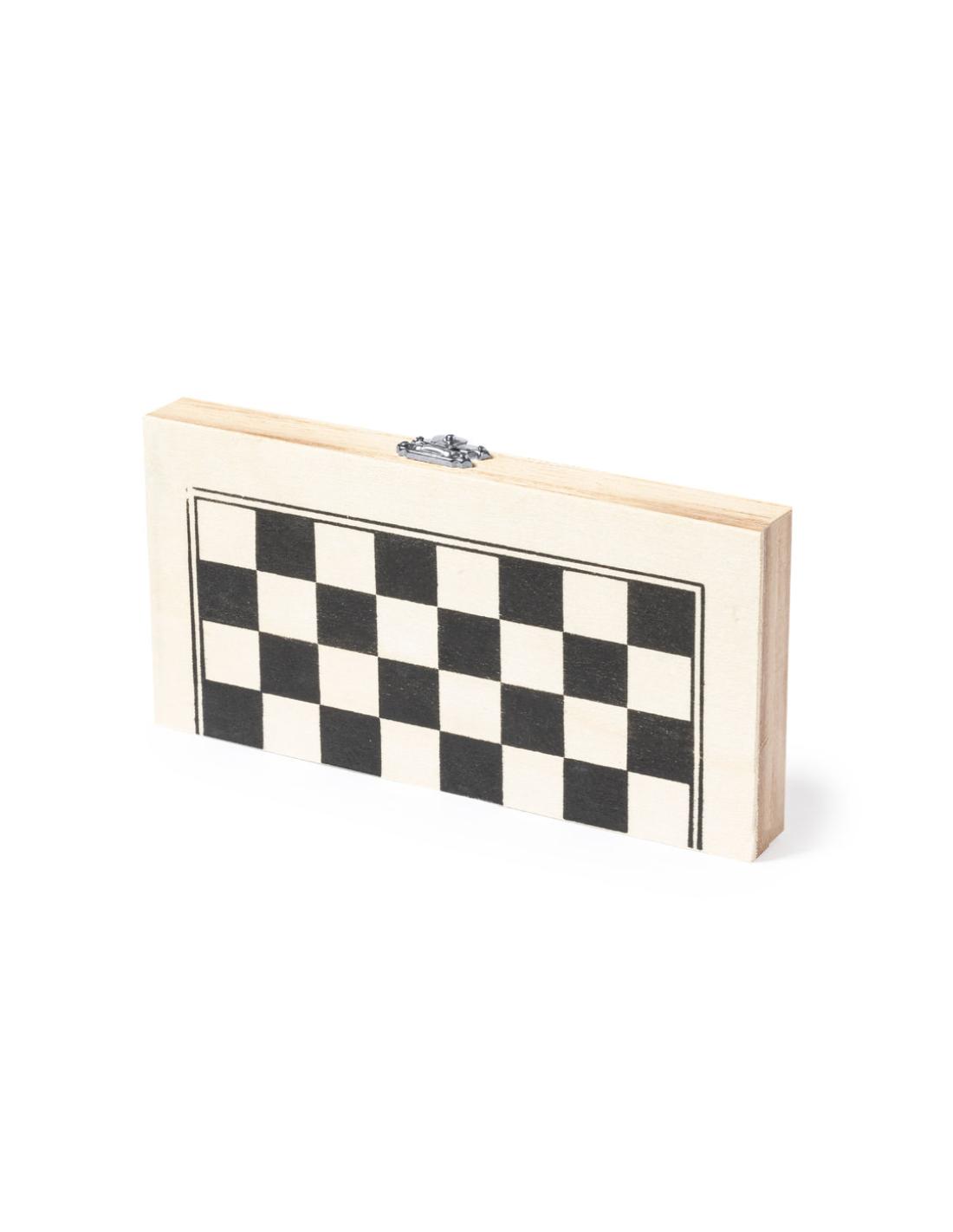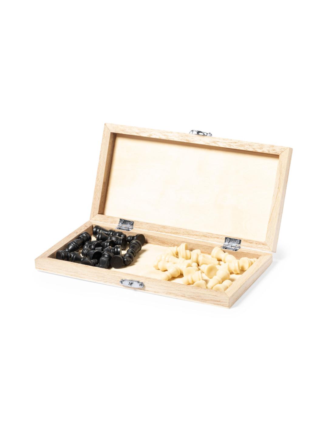Ajedrez con tablero plegable fabricado en madera natural de pino. Bisagras y cierre metálicos, con compartimento interior para almacenar las piezas. Presentación en caja individual de diseño kraft.