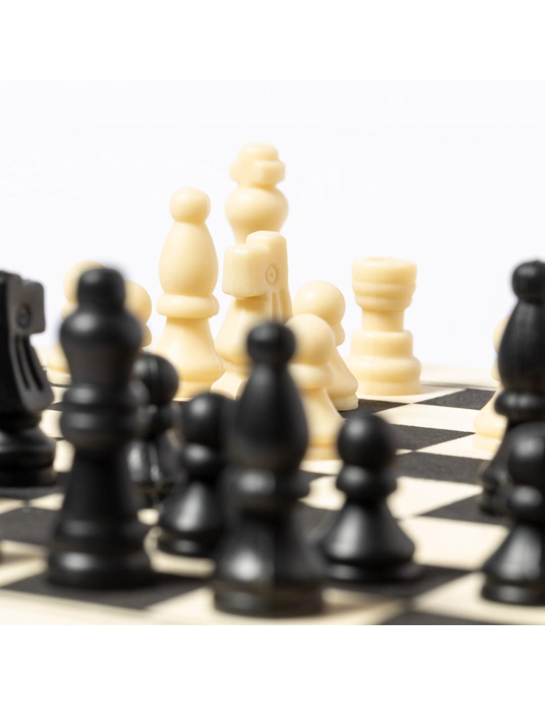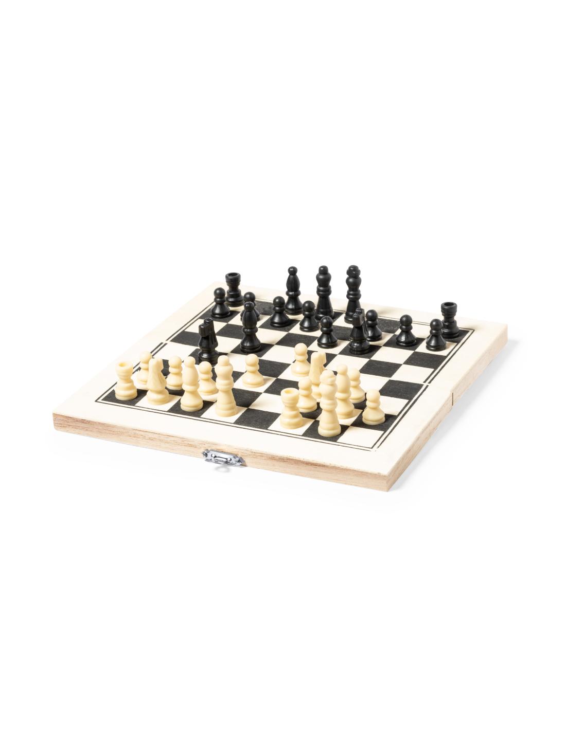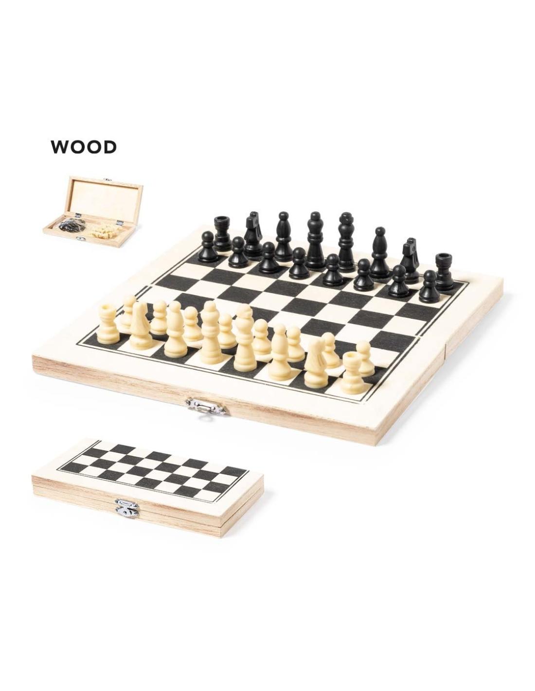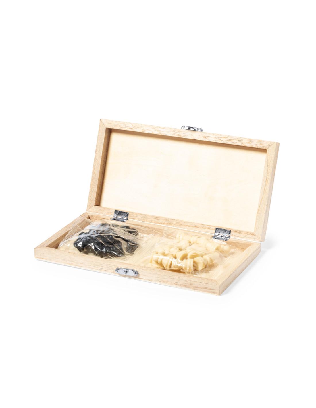Ajedrez con tablero plegable fabricado en madera natural de pino. Bisagras y cierre metálicos, con compartimento interior para almacenar las piezas. Presentación en caja individual de diseño kraft.