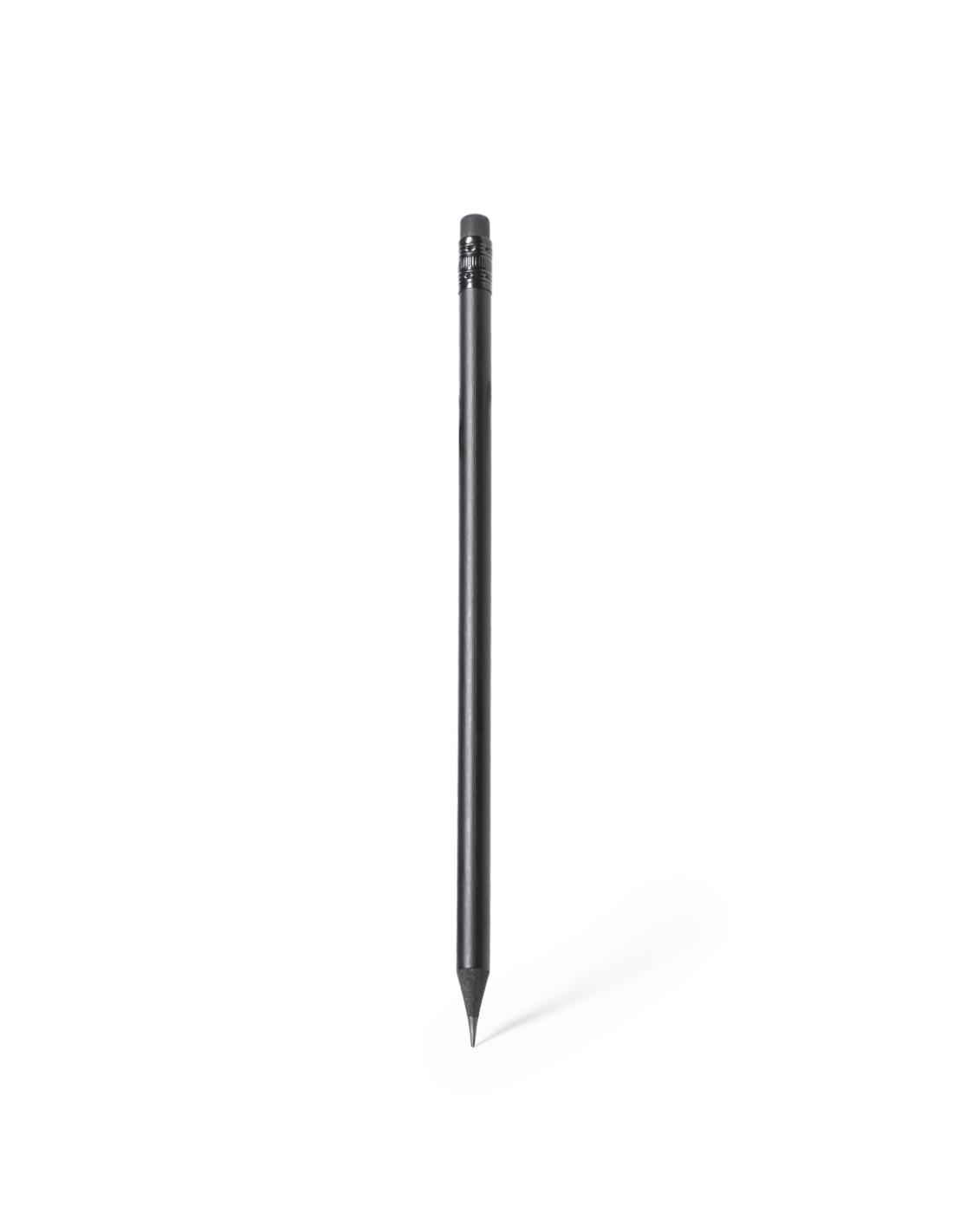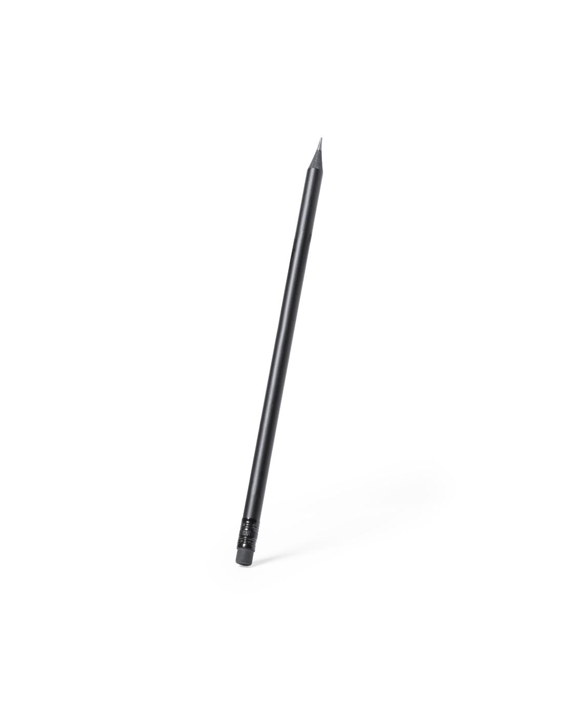 Lápiz de madera natural en acabado negro mate. Con goma de borrar, mina negra y punta afilada.