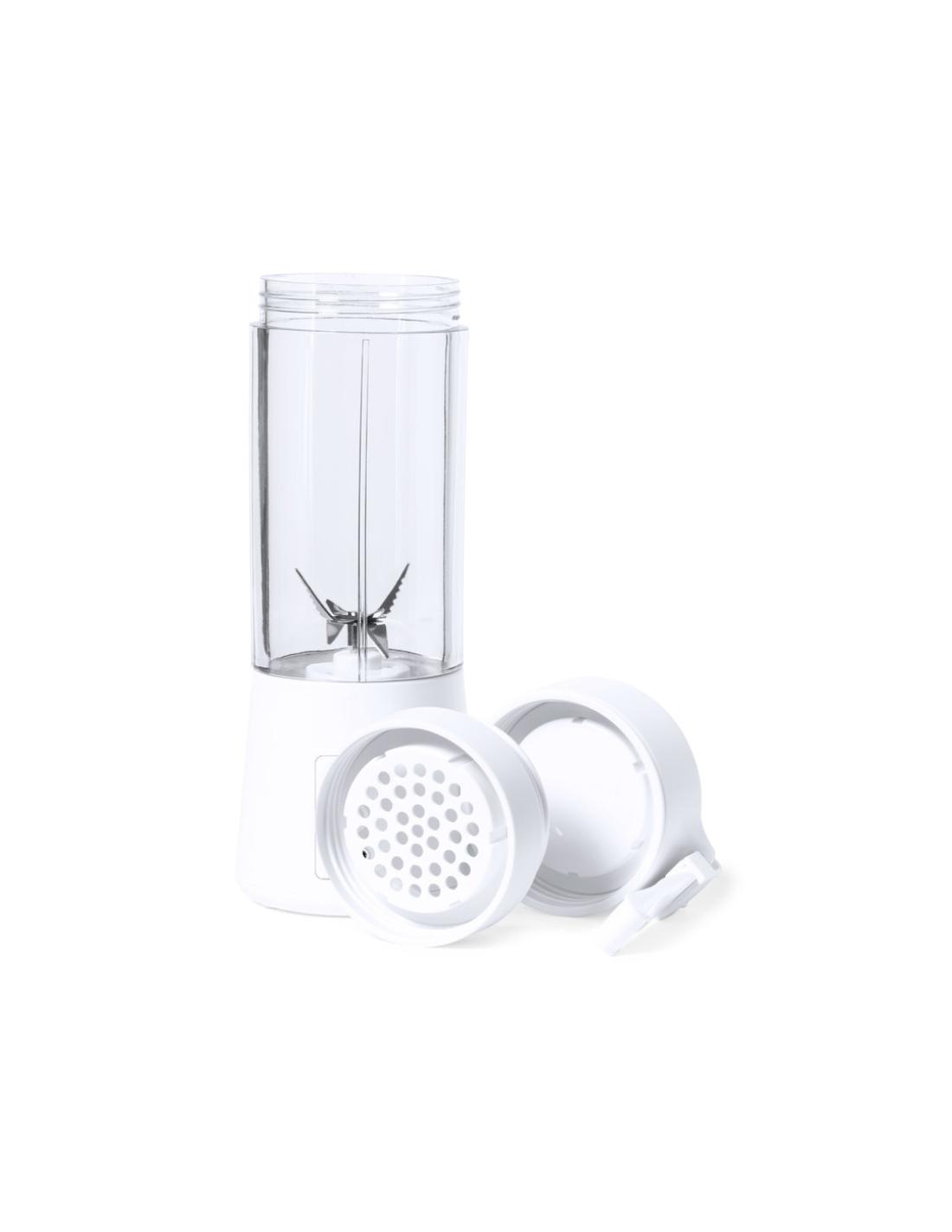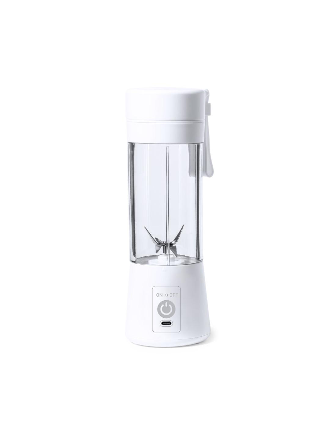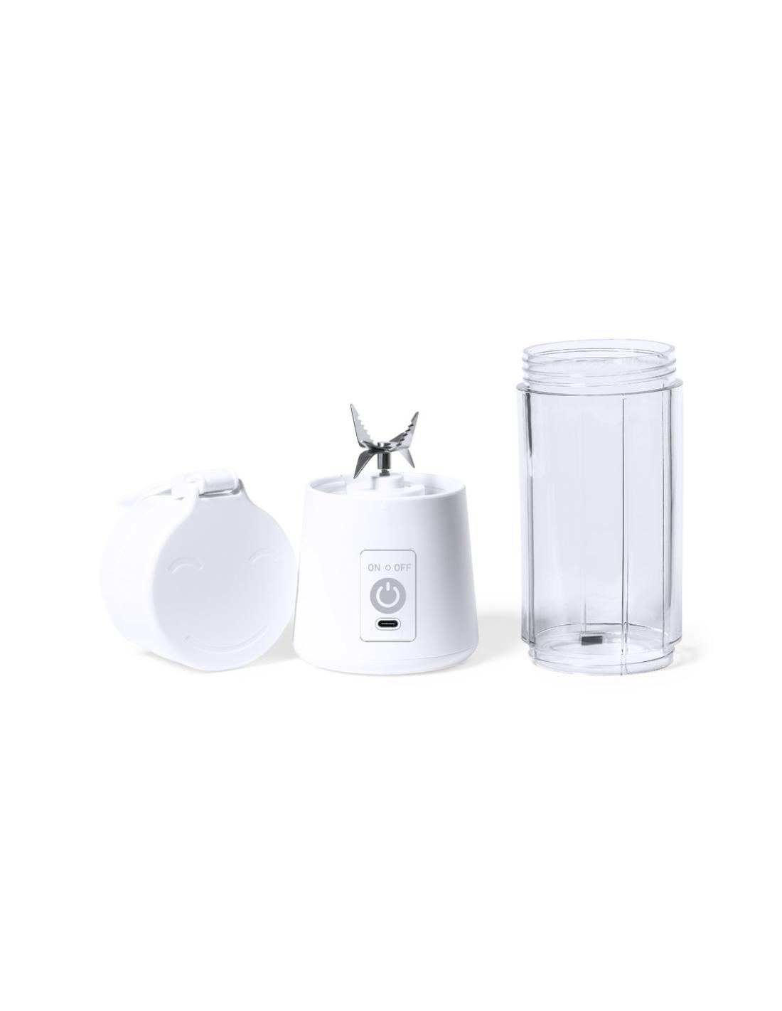 Licuadora fabricada en resistente material ABS de acabado blanco. De 380ml de capacidad y 150W de potencia, con limpiador y pinza incluidos. Batería de 2.000 mAh de capacidad, con conexión Tipo C (cable incluido). Presentada en caja individual de diseño kraft, con manual de instrucciones en español e inglés.