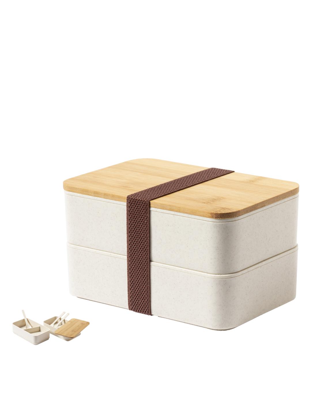 Fiambrera de 1,4l en resistente material PP veteado libre de BPA, con tapa de bambú. Dos compartimentos, cada uno de 700 ml de capacidad. Compartimento interior con tenedor, cuchara y cuchillo. Incluye cinta de seguridad exterior. Certificación Food Grade, garantizando la seguridad cuando los alimentos entran en contacto con el material usado para fabricar el producto.