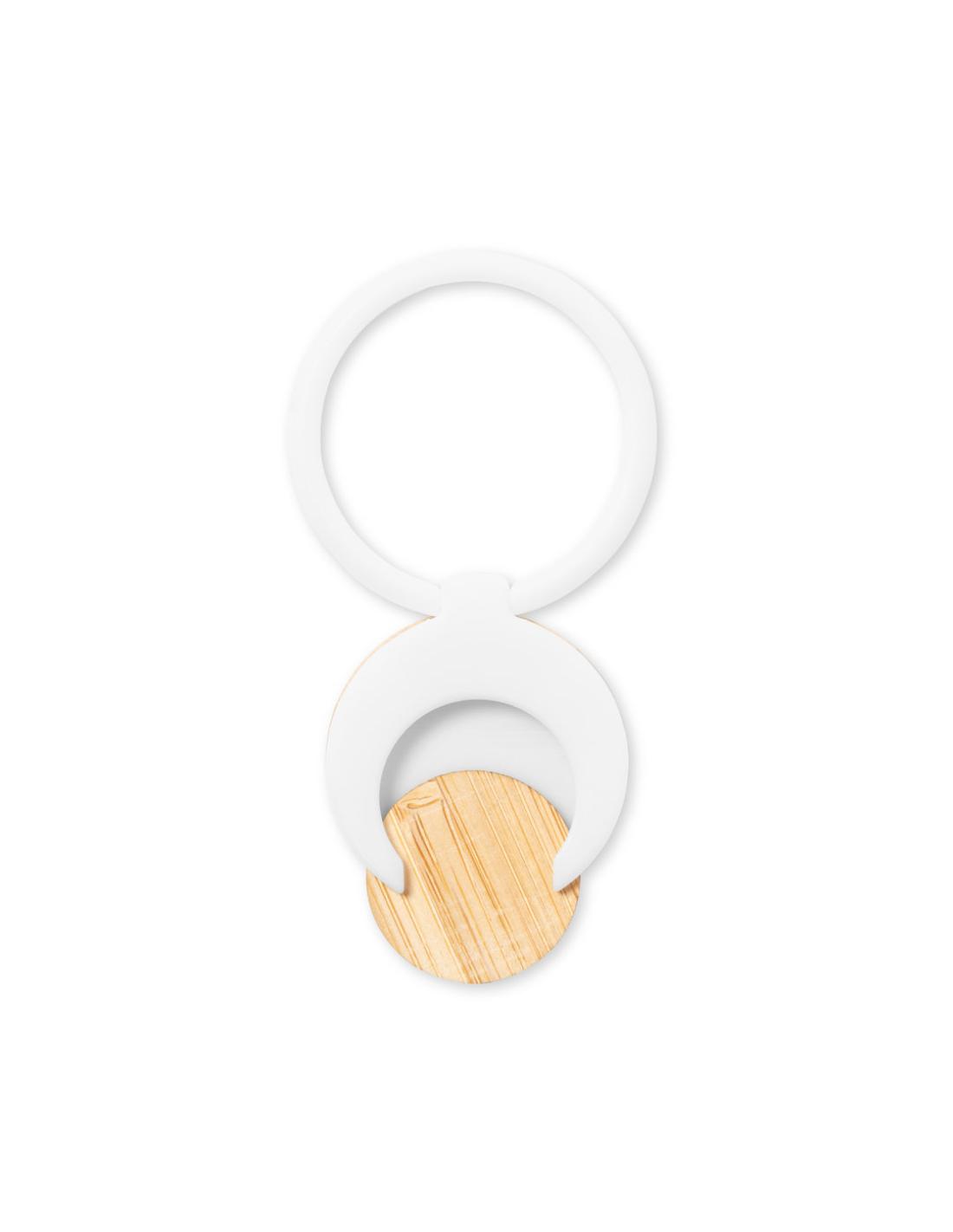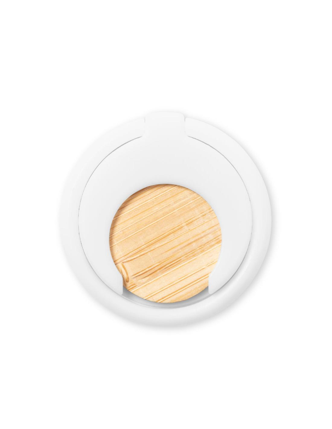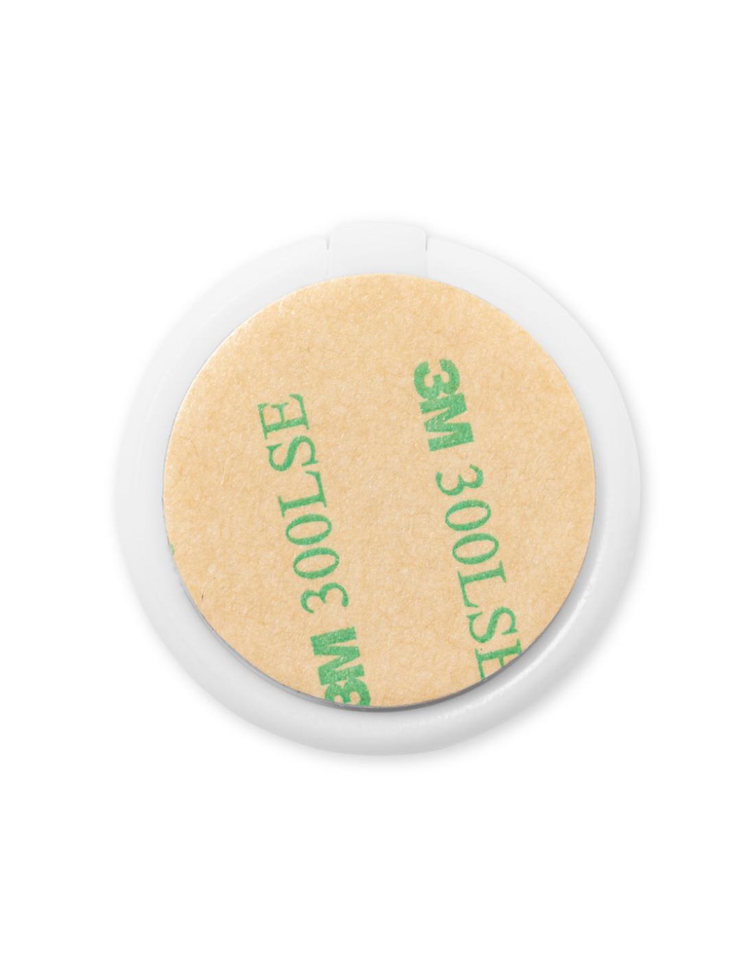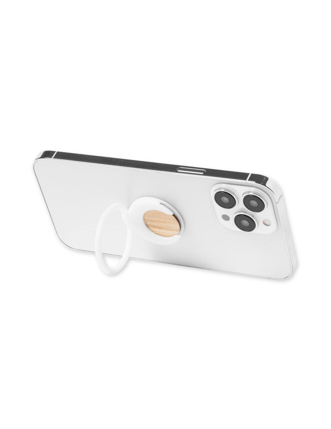 Soporte multifunción para smartphone, con moneda para carro de la compra integrada y anilla/soporte plegable. Cuerpo fabricado en resistente ABS de acabado blanco, con moneda en bambú. Con adhesivo de fijación extra fuerte y libre de residuos al despegarlo del dispositivo.