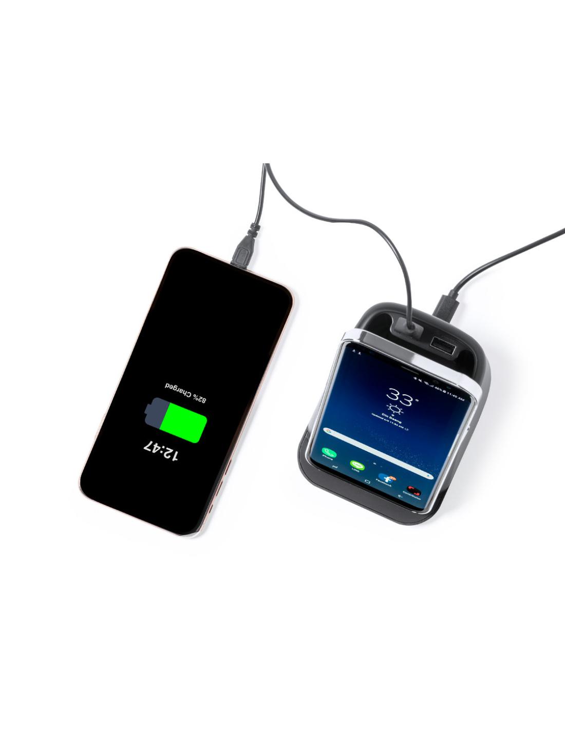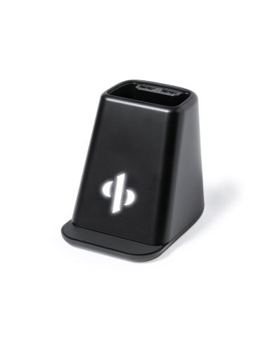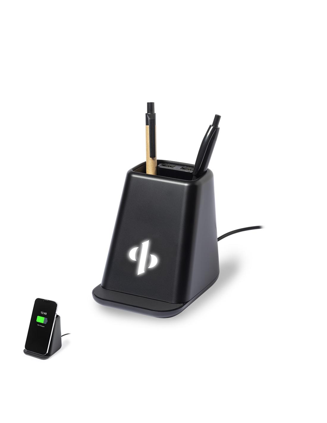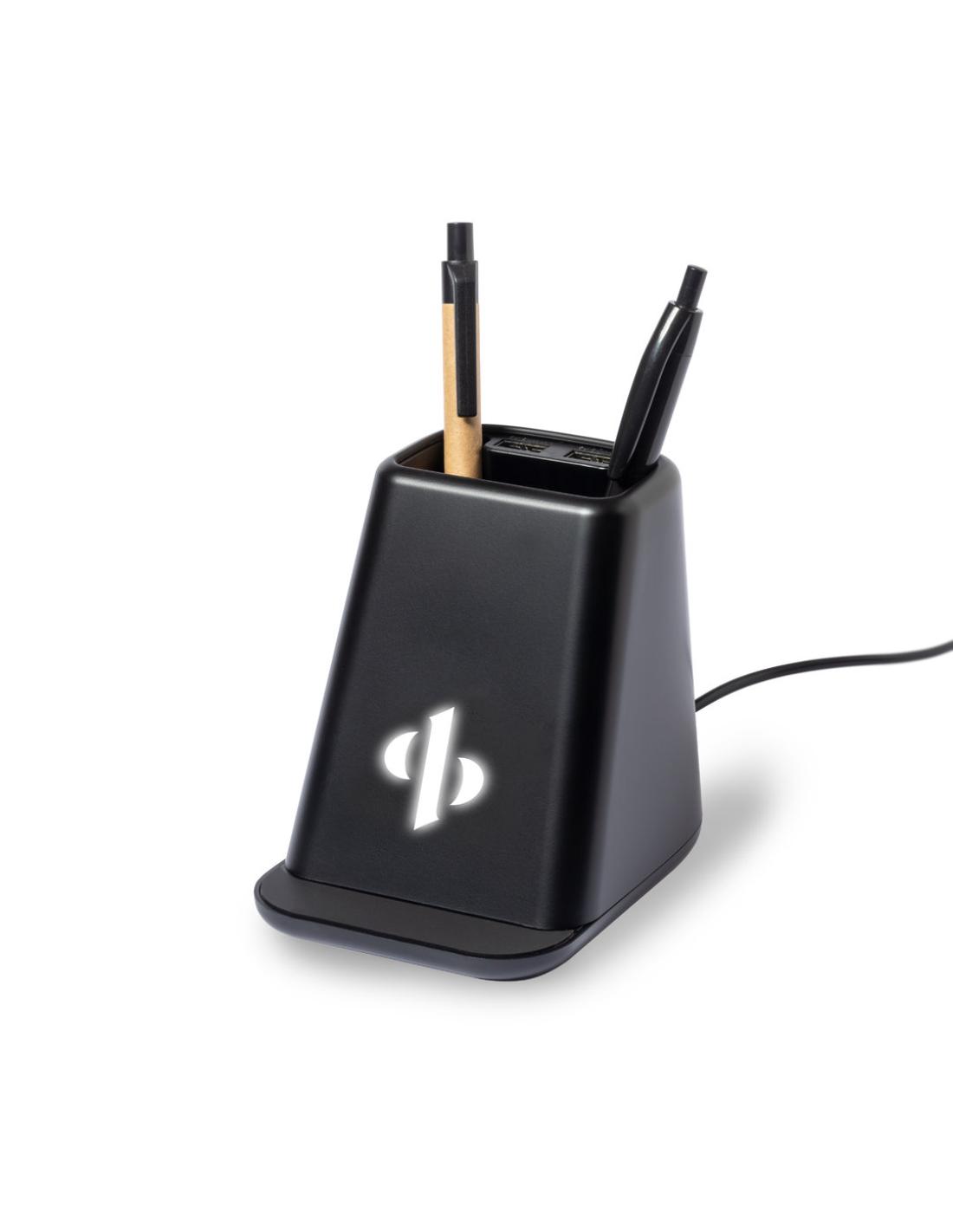 Lapicero multifunción con luz, especialmente diseñado para marcaje en láser e iluminar el logotipo.Con soporte para smartphone y cargador inalámbrico 15W integrado, compatible con dispositivos equipados con tecnología de carga inalámbrica Qi. Incluye 2 salidas USB (5V DC 2A)y cable de carga Tipo C de 150 cm. Base antideslizante y presentado en caja individual de diseño kraft, con manual de instrucciones en español e inglés.Fabricado conforme a los estándares RoHS y en cumplimiento con los siguientes requisitos de seguridad:Sistema de protección contra sobrecalentamiento.Sistema de protección contra sobrecarga.Sistema de bloqueo para evitar cortocircuitos.