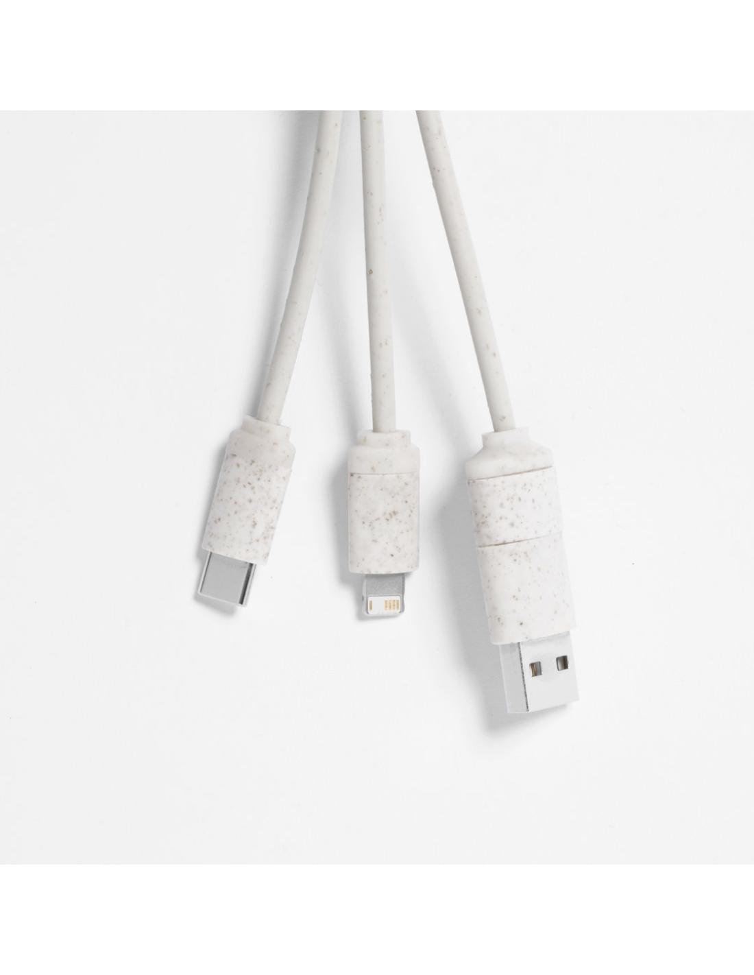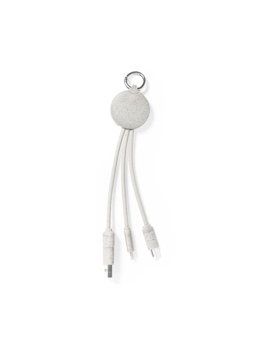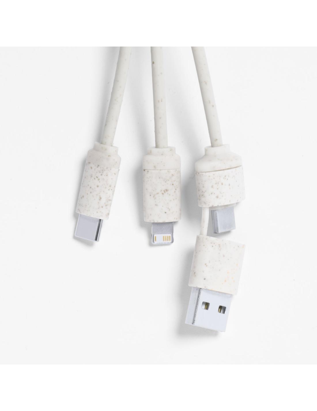 Cable cargador con anilla fabricado en caña de trigo, para así fomentar la utilización de materias primas naturales y reducir las emisiones contaminantes. Incluye conexiones de entrada Tipo C y USB salidas Lightning, Micro USB y USB. Presentado en bolsa individual de diseño kraft.