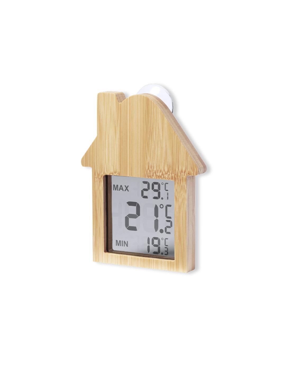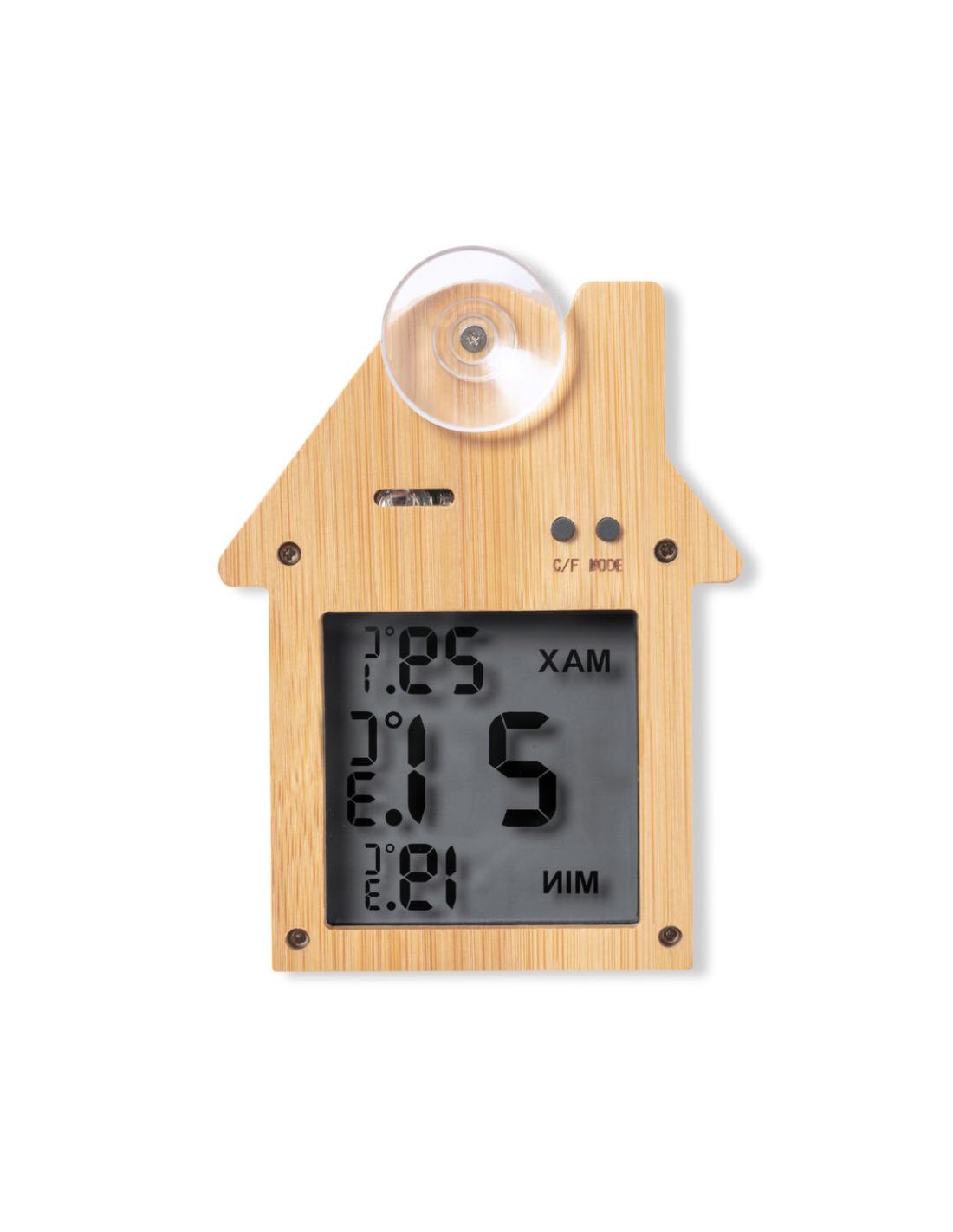 Estación meteorológica fabricada en bambú y con fijación por ventosa. Pantalla LCD de fácil lectura con termómetro, registro de temperaturas máximas/mínima, y reloj. Alimentación con pila (de botón incluida). Presentada en caja individual de diseño kraft, con manual de instrucciones en español e inglés.