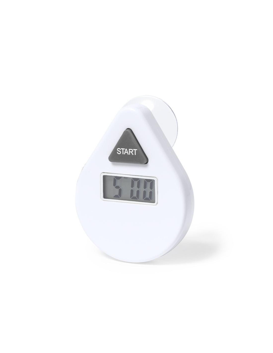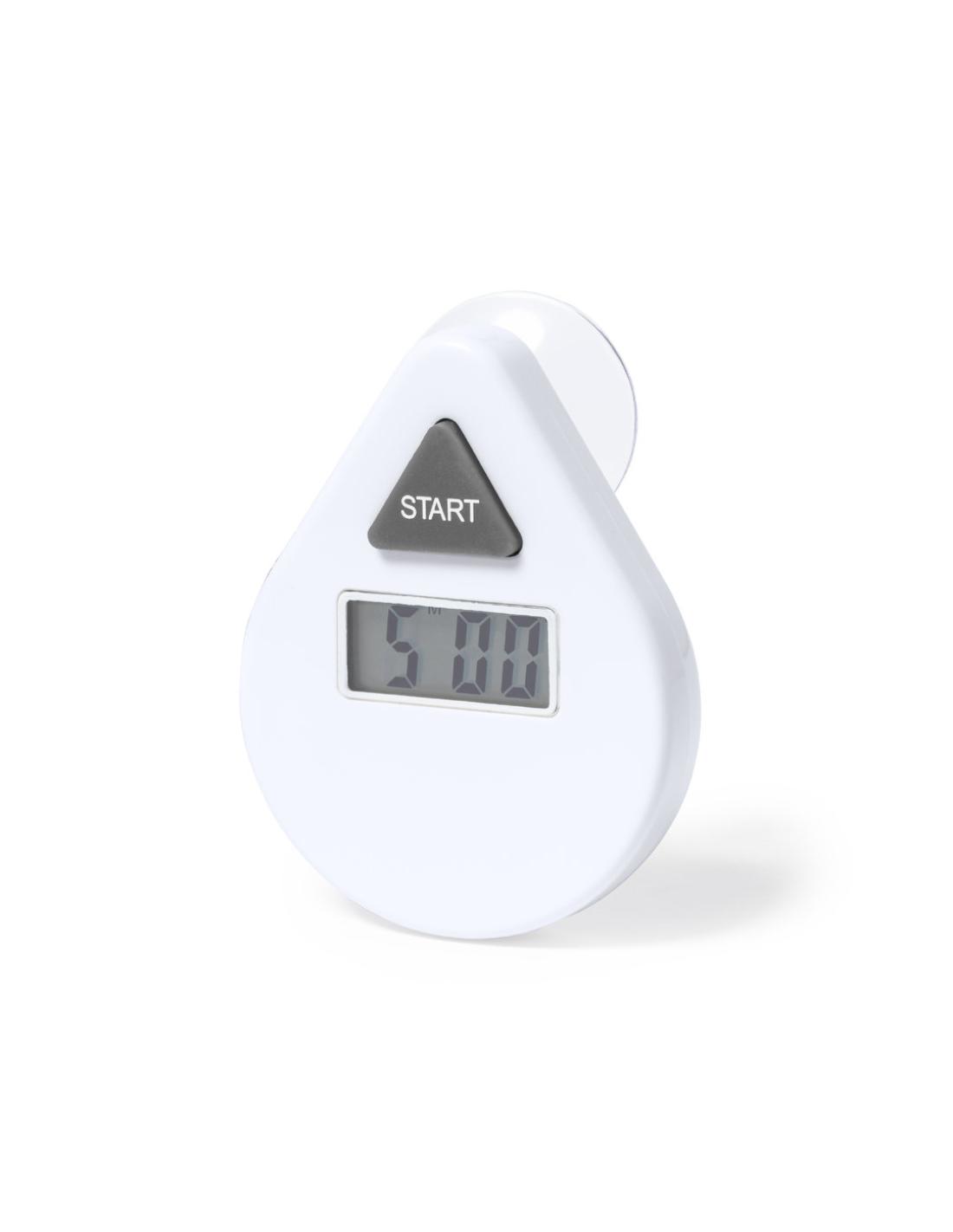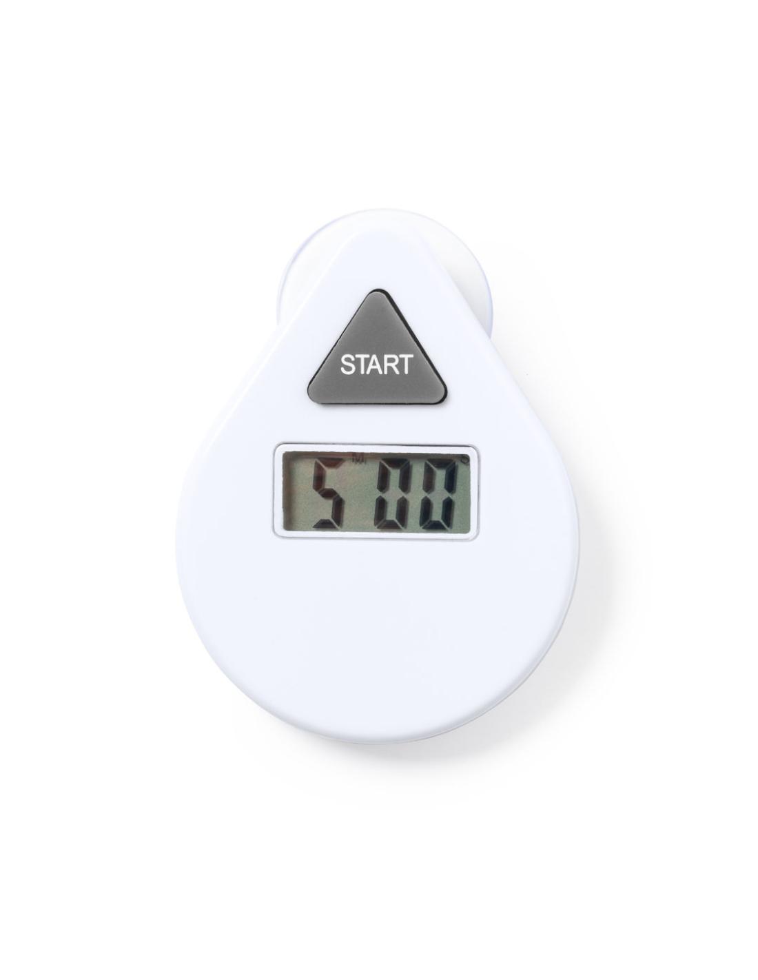 Temporizador fabricado en resistente ABS de acabado blanco y con fijación por ventosa. Pantalla LCD de fácil lectura, con botón de control de cuenta atrás (5 minutos). Alimentación con pila (de botón incluida). Presentada en caja individual de diseño kraft, con manual de instrucciones en español e inglés.