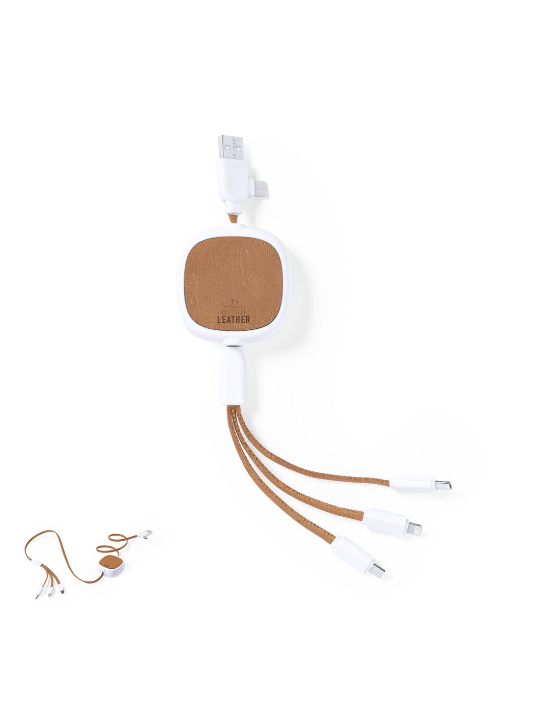 Cable cargador extensible de 1 m, fabricado en RABS y en elegante color blanco, con cables y detalles en cuero reciclado.Pieza central con cubierta en cuero reciclado y mecanismo interior que convierte al cable en extensible. Con conexiones de entrada Tipo C y USB y salidas Tipo C,Lightning y Micro USB. 5V DC 2.4AEl material RABS o ABS Reciclado y el cuero reciclado proceden del reciclado de artículos al final de su vida útil. Los materiales reciclados empleados incorporan la certificación RCS, que garantiza el origen reciclado de los mismos.