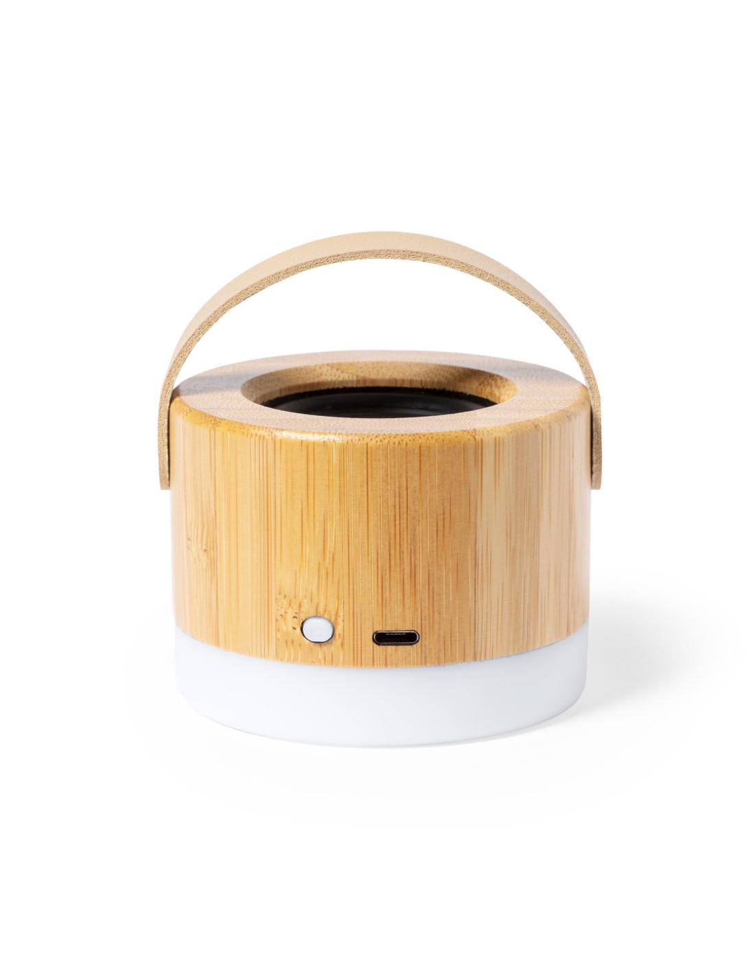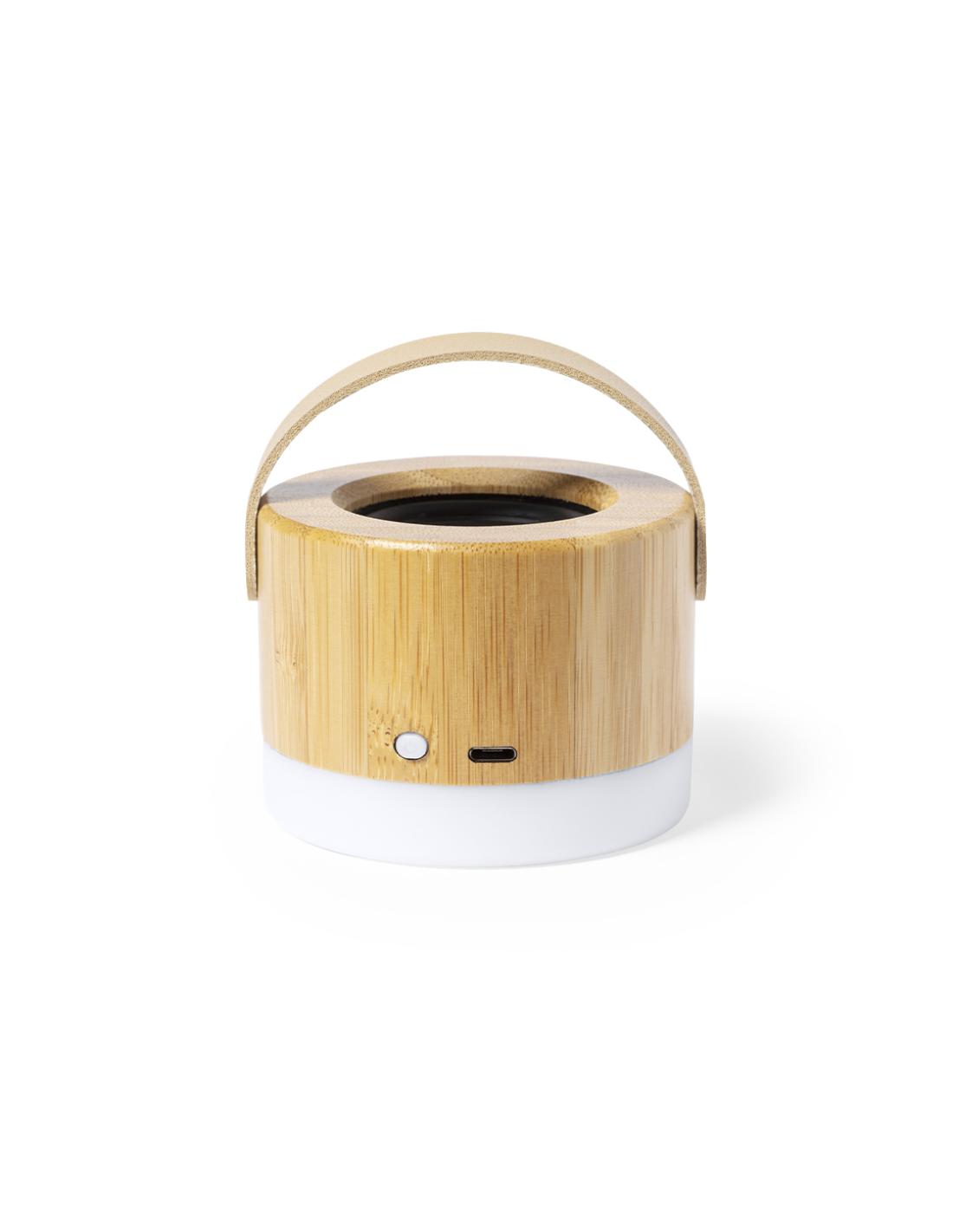 Altavoz Bluetooth de tamaño compacto, con 3W de potencia y luz LED. Fabricado en bambú y ABS, con cinta de transporte en polipiel. Batería de litio de 300mAh, con cable de carga Tipo C incluido. Presentado en caja individual de diseño kraft, con manual de instrucciones en español e inglés.