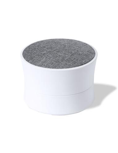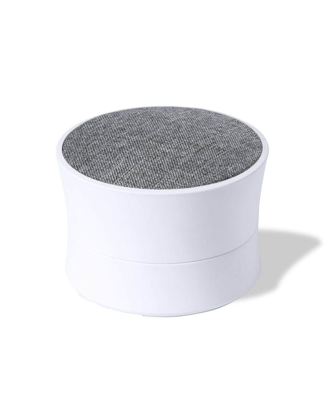 Altavoz Bluetooth de tamaño compacto y 3W de potencia. Combinación de cuerpo en ABS blanco con rejilla de poliéster en variada gama de colores. Batería de litio de 300mAh, con cable de carga Tipo C incluido. Presentado en caja individual de diseño kraft, con manual de instrucciones en español e inglés.