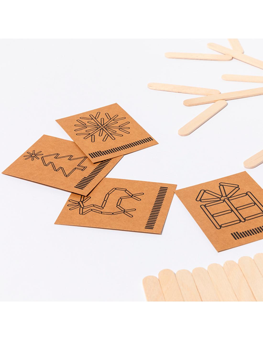 Original juego de habilidad que consiste en construir correctamente las figuras presentadas en las tarjetas visuales con las diferentes piezas del juego. Un divertido juego con el que fomentar la agilidad mental. Incluye 36 piezas de madera natural en diferentes tamaños para construir las figuras(8 largas y 28 cortas) y 4 divertidos diseños de estrellas con tarjetas visuales en cartón reciclado. Presentado en bolsa 100% algodón.Elaborado con elementos vegetales para así fomentar la utilización de materias primas naturales y reducir las emisiones contaminantes.