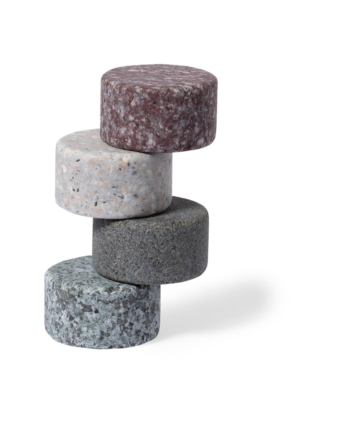 Set de 4 cubitos reutilizables. Fabricados en granito, mantieniendo la bebida fría sin alterar sus propiedades al no diluir su contenido en agua, además de mantener el sabor original de la misma. Presentados en funda de algodón con cordón de cierre.