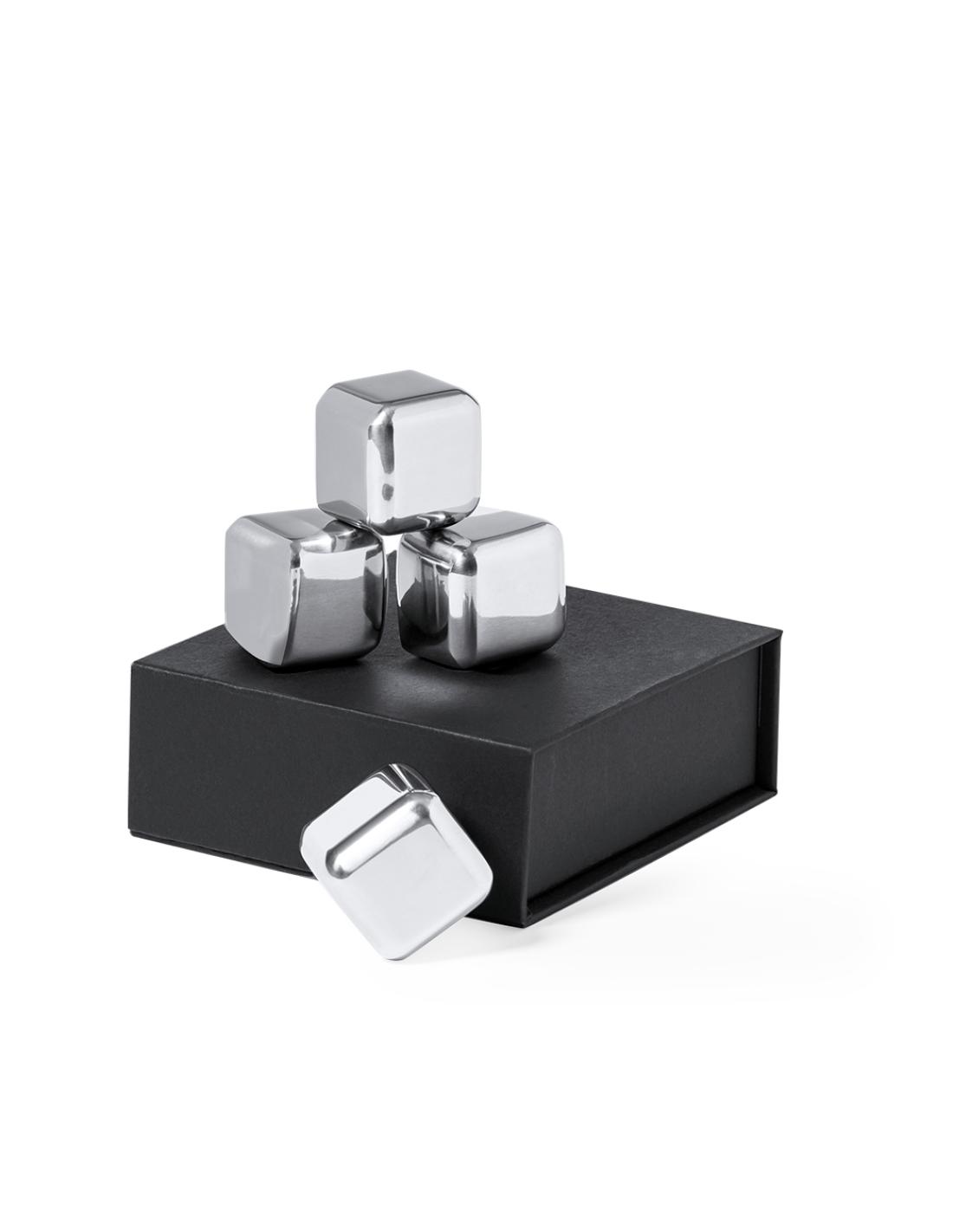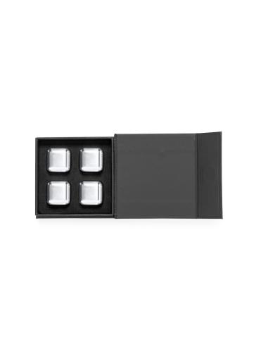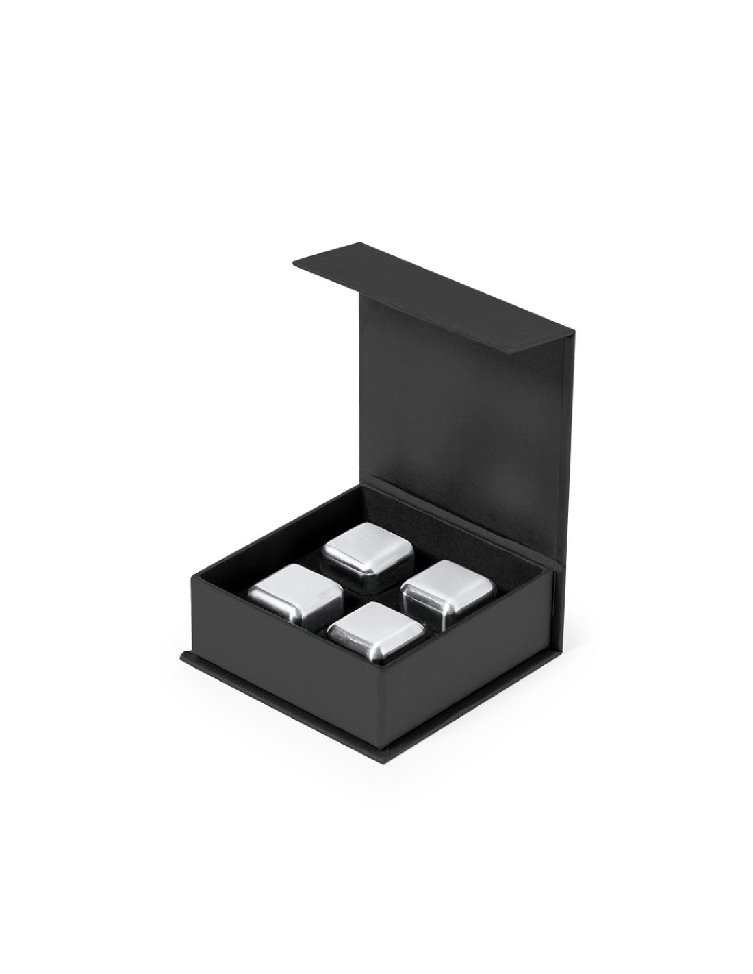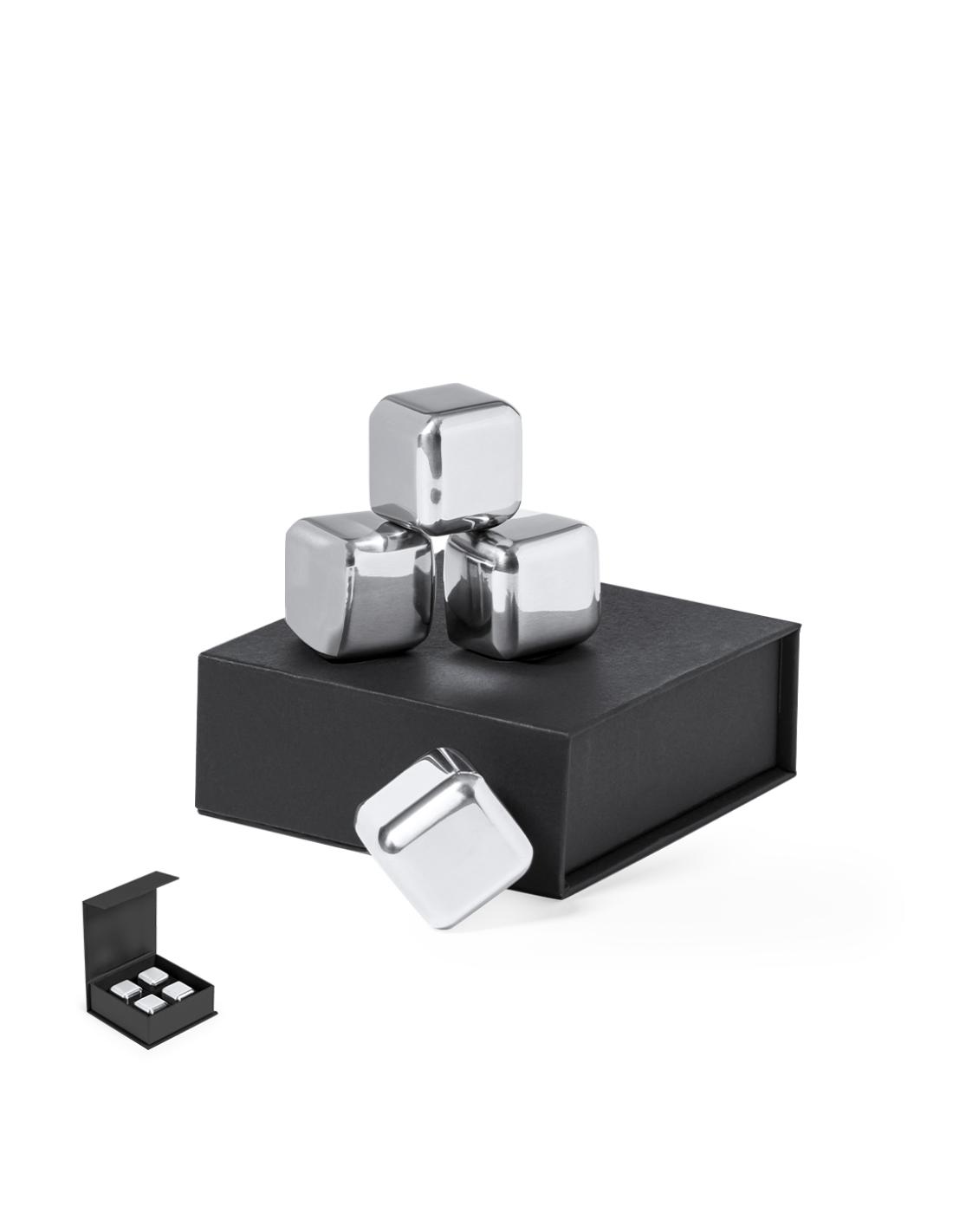 Set de 4 cubitos reutilizables. Fabricados en acero inoxidable, manteniendo la bebida fría sin alterar sus propiedades al no diluir su contenido en agua, además de mantener el sabor original de la misma. Presentados en elegante estuche color negro con interior troquelado.