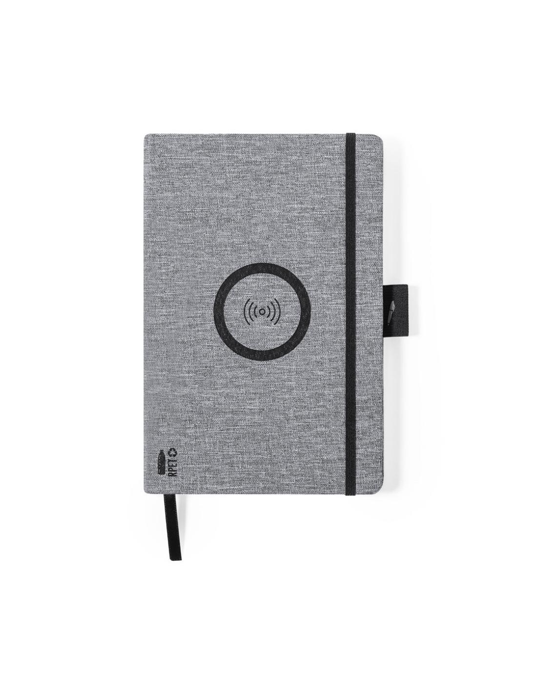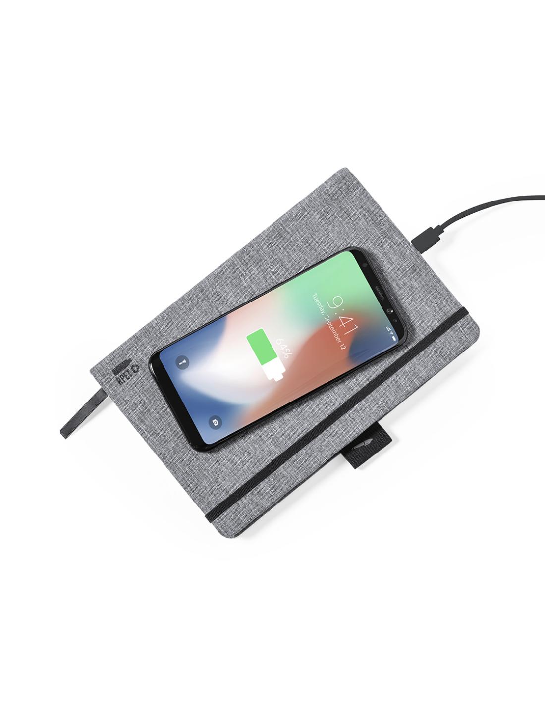 Bloc de notas cargador de línea nature en resistente poliéster 300D RPET de tamaño A5 y elaborado a partir de plástico reciclado, para así fomentar la reutilización de residuos plásticos y ayudar a la sostenibilidad del planeta. Con cargador inalámbrico de 10W integrado en la portada. Incluye 80 hojas con disposición a una raya. Compatible con smartphones con tecnología de carga inalámbrica. Incluido cable de carga Tipo C y disponible manual de instrucciones en español e inglés.