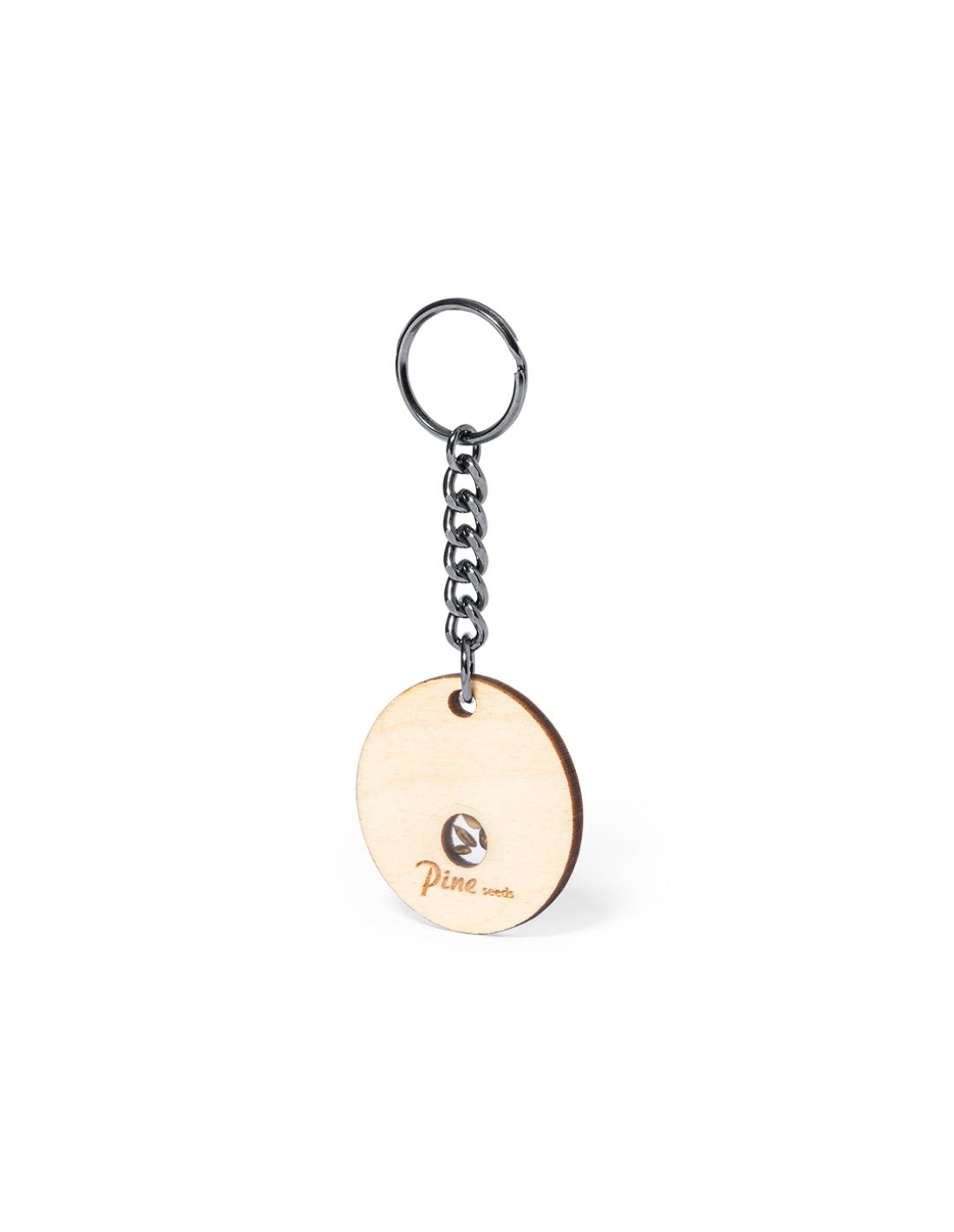 Llavero en suave y elegante madera de haya. Incluye cápsula con semillas de pino. Un respetuoso y sostenible regalo con el que fomentar y promover el cuidado del medio ambiente. Presentado en caja individual de diseño kraft.