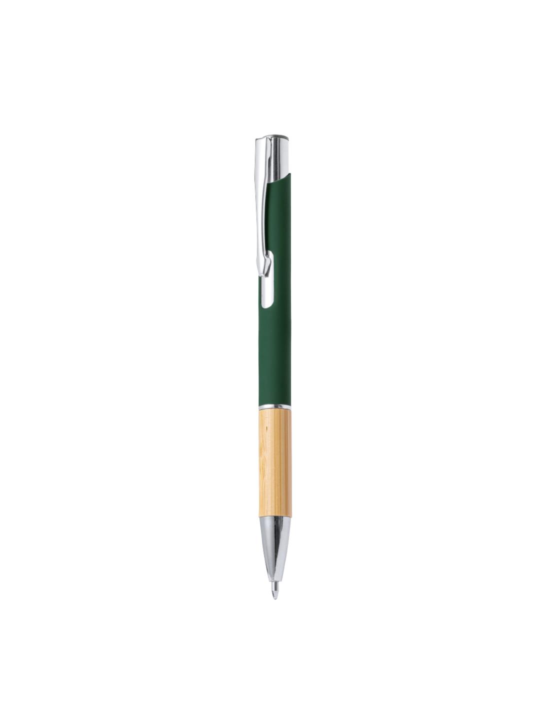 Elegante bolígrafo de línea nature y mecanismo pulsador. Cuerpo en resistente aluminio de acabado goma y empuñadura en bambú, con la caña en una amplia gama de distintivos colores. Clip metálico, con mecanismo pulsador y en tinta azul. Presentado en bolsa individual reciclada.