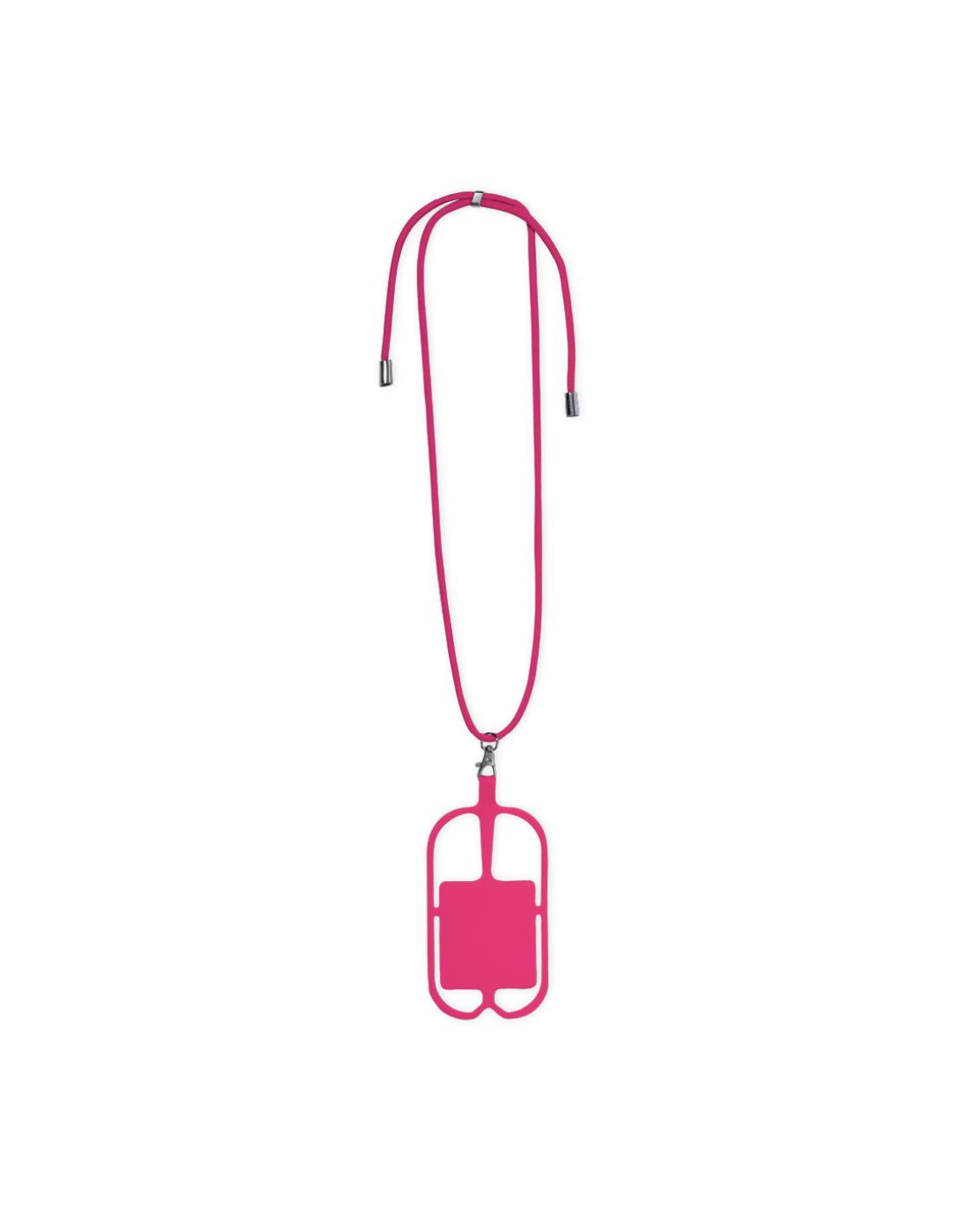 Original lanyard portamóvil en resistente poliéster y flexible silicona. Con accesorio de transporte para todo tipo de smartphones, capaz de ajustarse a todas las pantallas. Ajustador en cuello y extremos de cordones en acabado cromado. Incluye amplia zona de marcaje. Disponible en variada gama de colores.