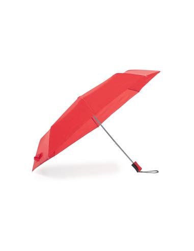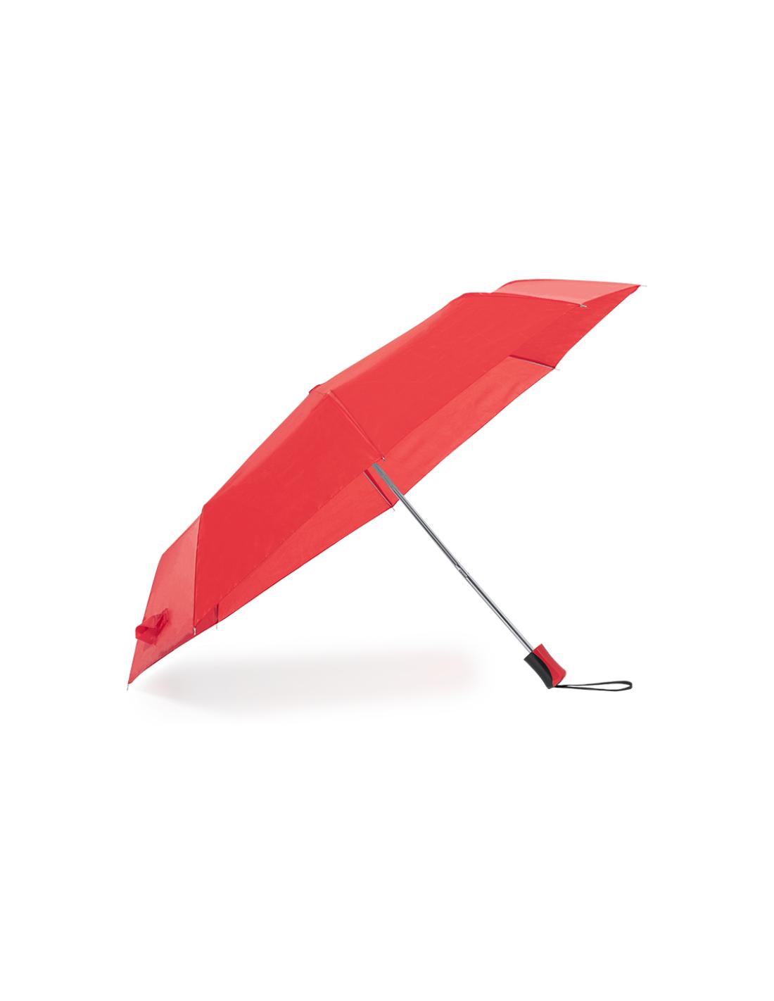 Paraguas plegable de 8 paneles de poliéster 190T. De apertura manual, con varillas metálicas en color plateado y cierre de velcro. Mango ergonómico con cinta de transporte y funda protectora a juego. Disponible en amplia gama de colores. Presentado en bolsa individual reciclada.