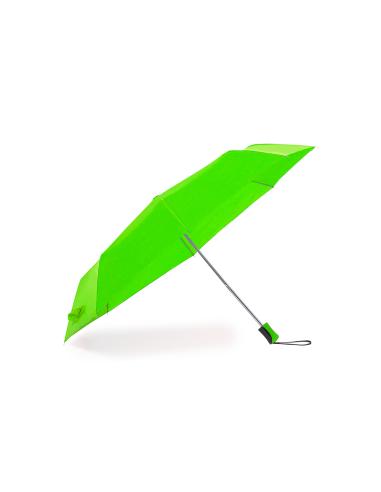 Paraguas plegable de 8 paneles de poliéster 190T. De apertura manual, con varillas metálicas en color plateado y cierre de velcro. Mango ergonómico con cinta de transporte y funda protectora a juego. Disponible en amplia gama de colores. Presentado en bolsa individual reciclada.