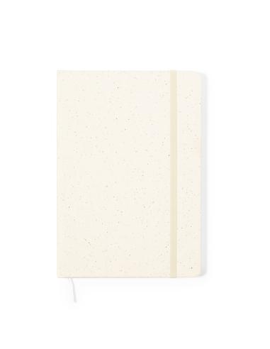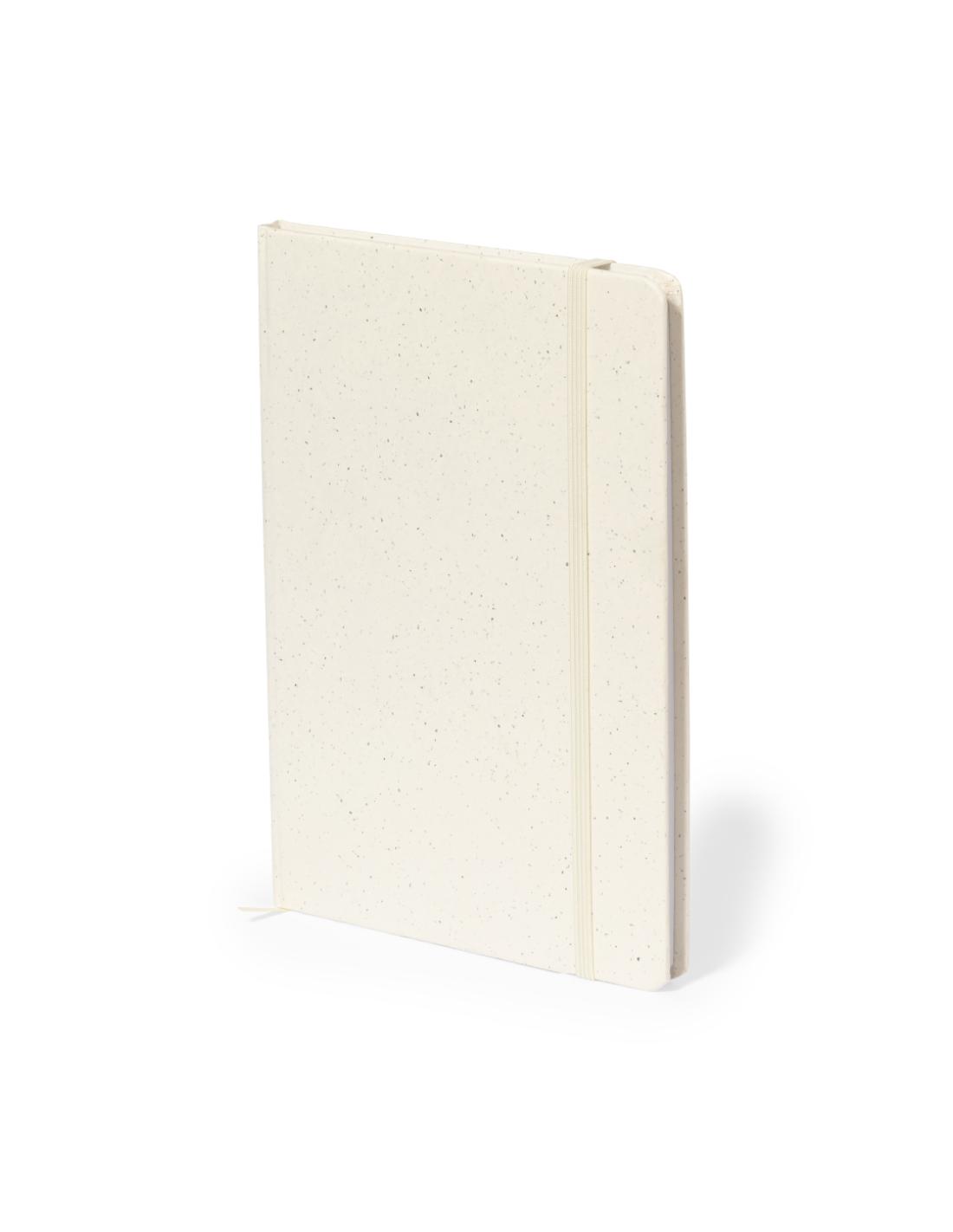 Bloc de notas A5 con tapas duras en resistente cartón reciclado. De 100 hojas blancas lisas y banda elástica para su cierre. Presentado en bolsa individual reciclada.
