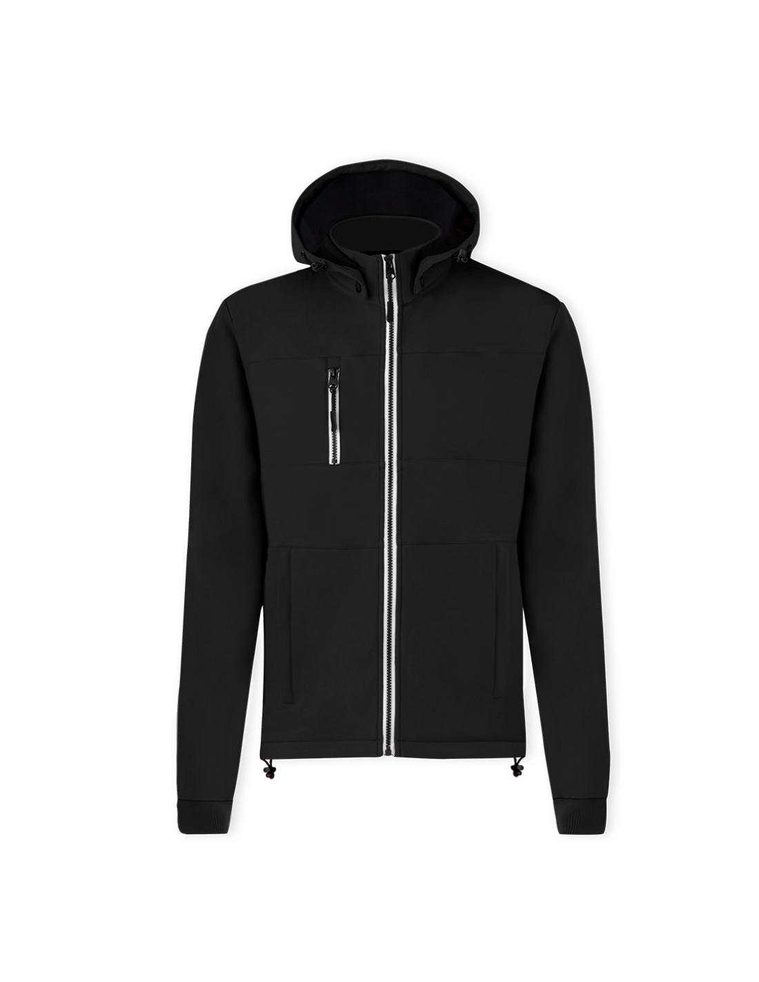 Chaqueta de resistente y transpirable material soft shell de 300g/m2. De corte moderno, con cremallera central, bolsillos laterales y práctico bolsillo en pecho con cierres de cremallera y tiradores en contraste. Cuello elevado con capucha ajustable y desmontable. Dobladillo inferior con cordón ajustable. Mangas con cómodos puños de punto en color a juego. Exterior en soft shell resistente al viento y al agua, e interior de cálido micropolar en color contraste. Disponible en tallas XS, S, M, L, XL, XXL.