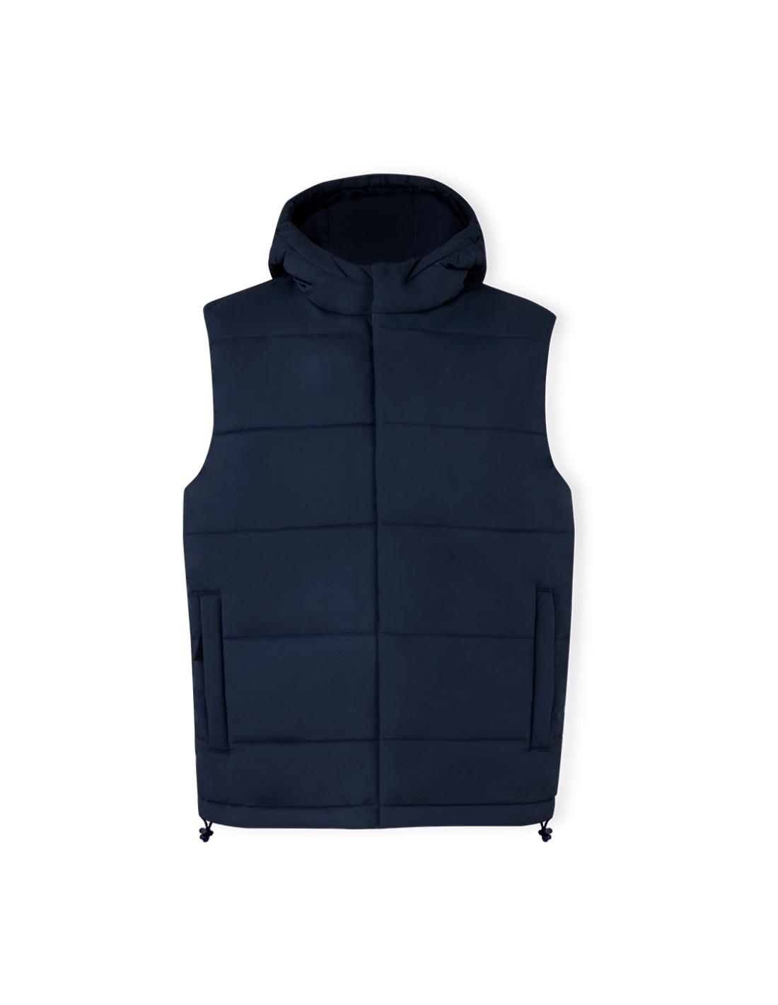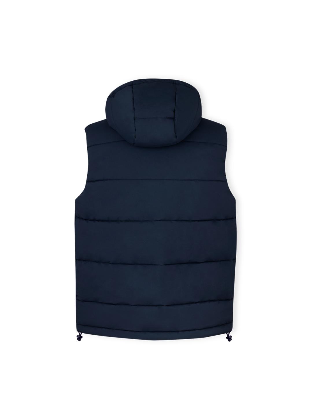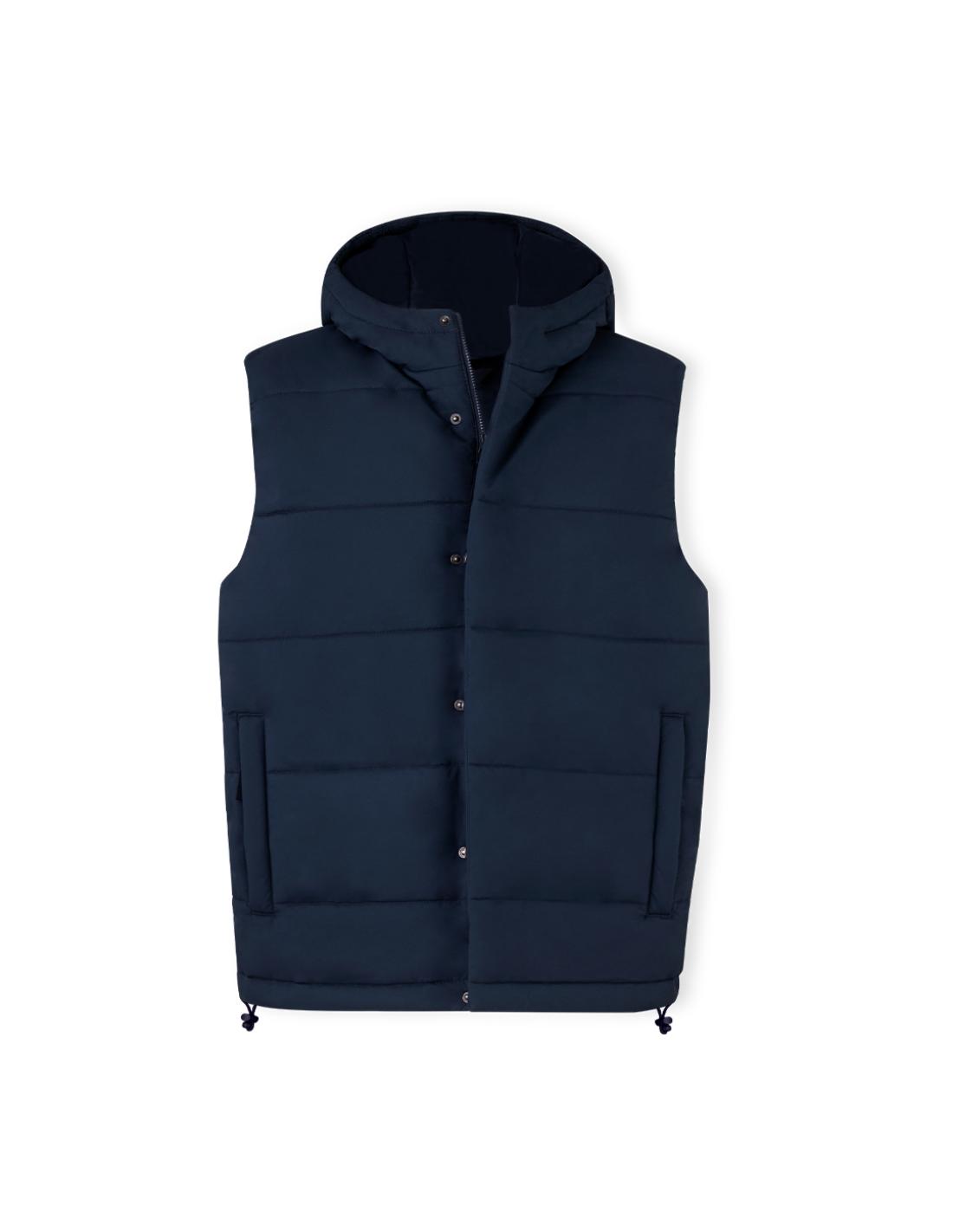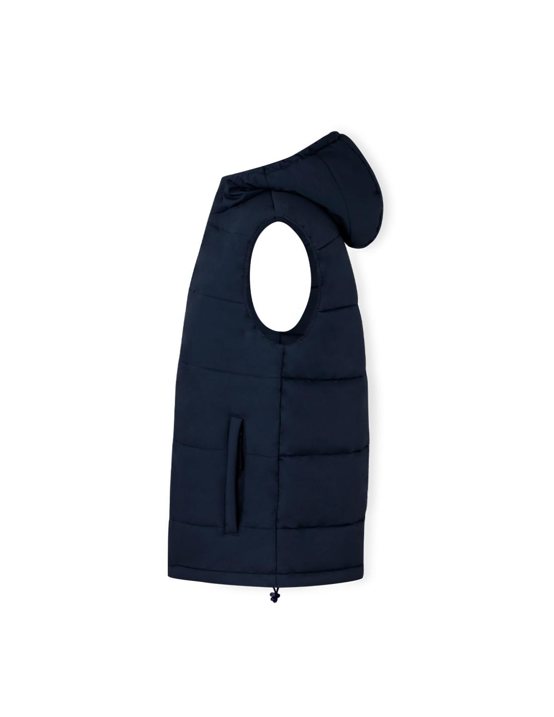 Chaleco con capucha, en cálido y suave material 100% poliéster. En material ligero, resistente al viento y al agua. Diseño de elegante construcción horizontal y acolchado, con capucha fija integrada. Doble cierre frontal de cremallera y corchetes. Bolsillos laterales con tiradores a juego y cordón ajustable en dobladillo. Disponible en tallas XS, S, M, L, XL, XXL.