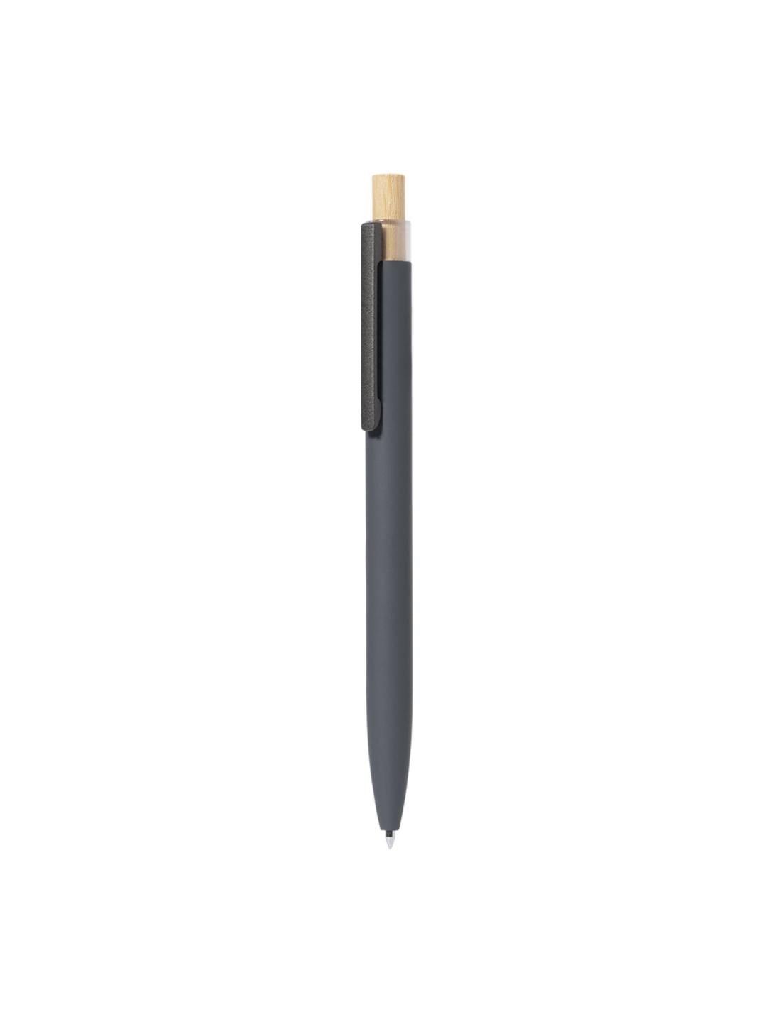 Bolígrafo de mecanismo pulsador fabricado en aluminio reciclado. Pulsador en bambú y cuerpo acabado goma, disponible en variada gama de elegantes colores. Clip metálico y distintivo aluminio reciclado en la parte superior del bolígrafo. De cartucho jumbo y en tinta azul. Presentado en bolsa individual reciclada.El aluminio reciclado es un material con posibilidades de reciclaje casi infinitas, sin perder sus propiedades originales y consumiendo menos energía en este proceso.Certificación GRS (Global Recycled Standard / Estándar de Reciclaje Global), que garantiza el origen reciclado del material usado para fabricar el producto.