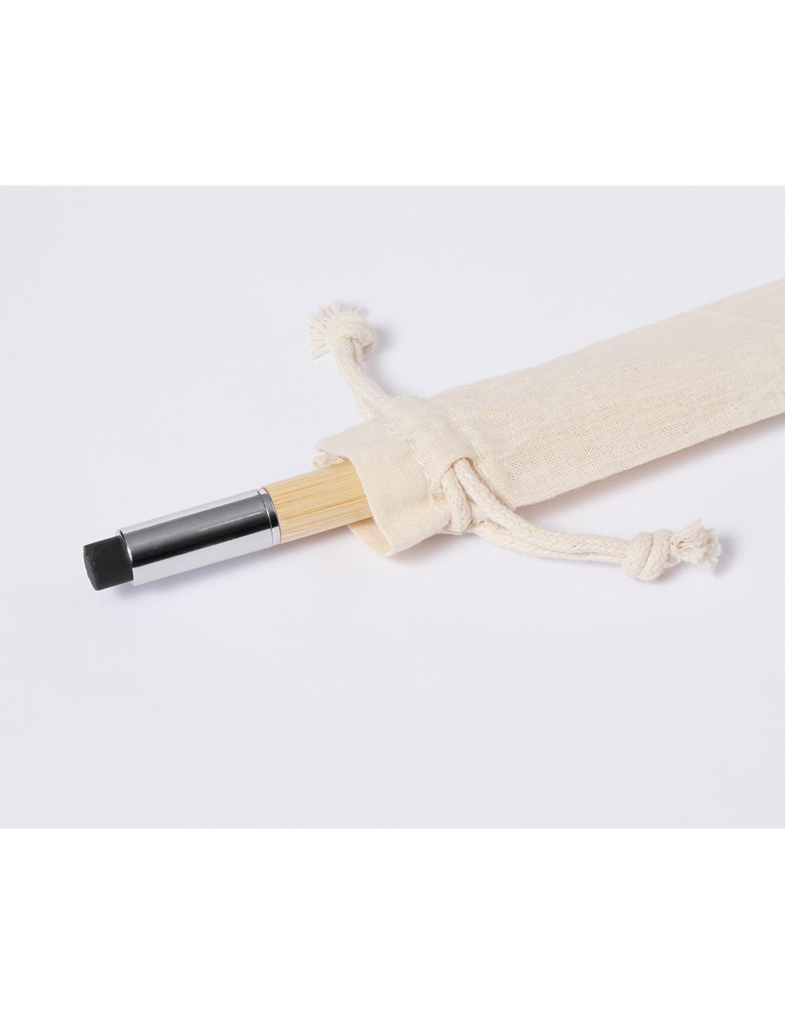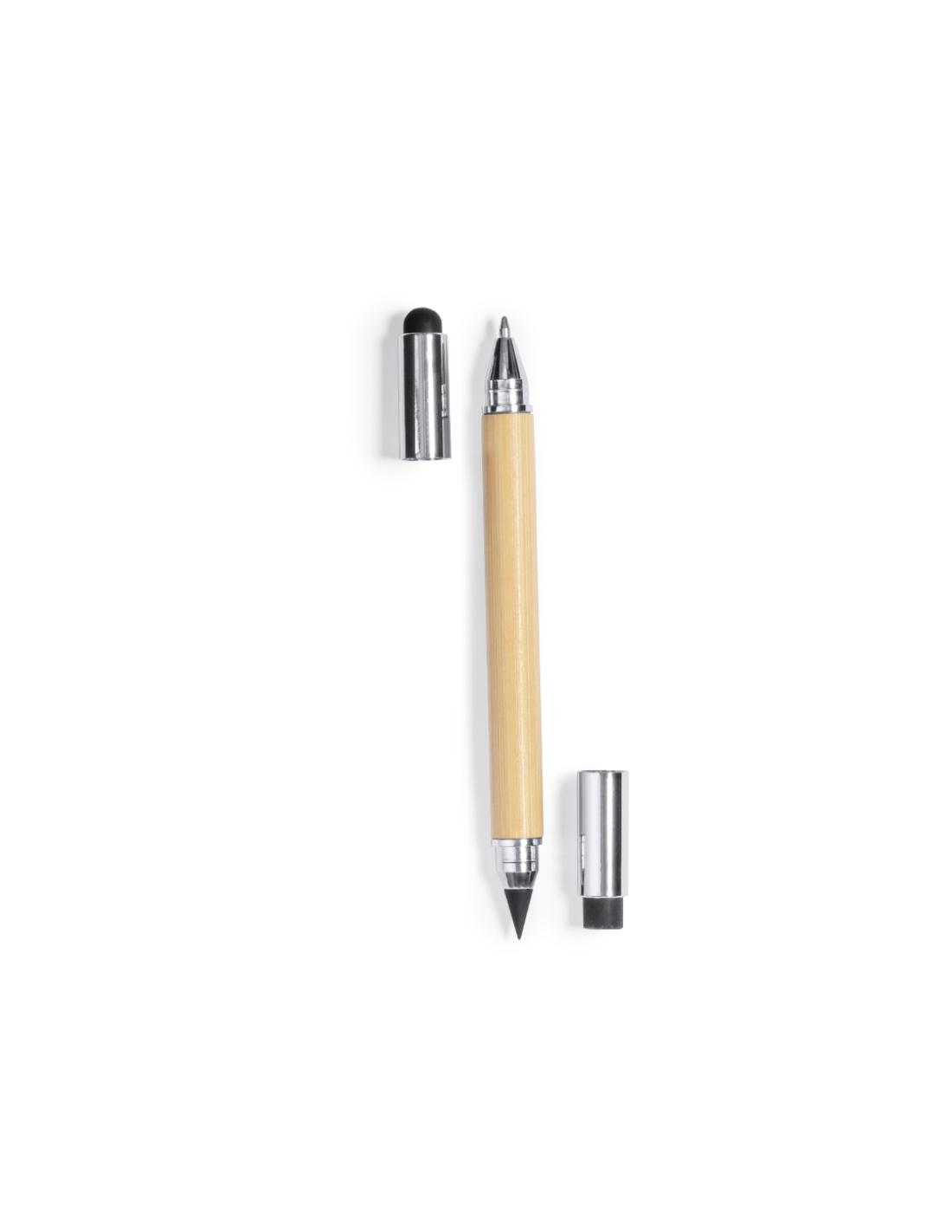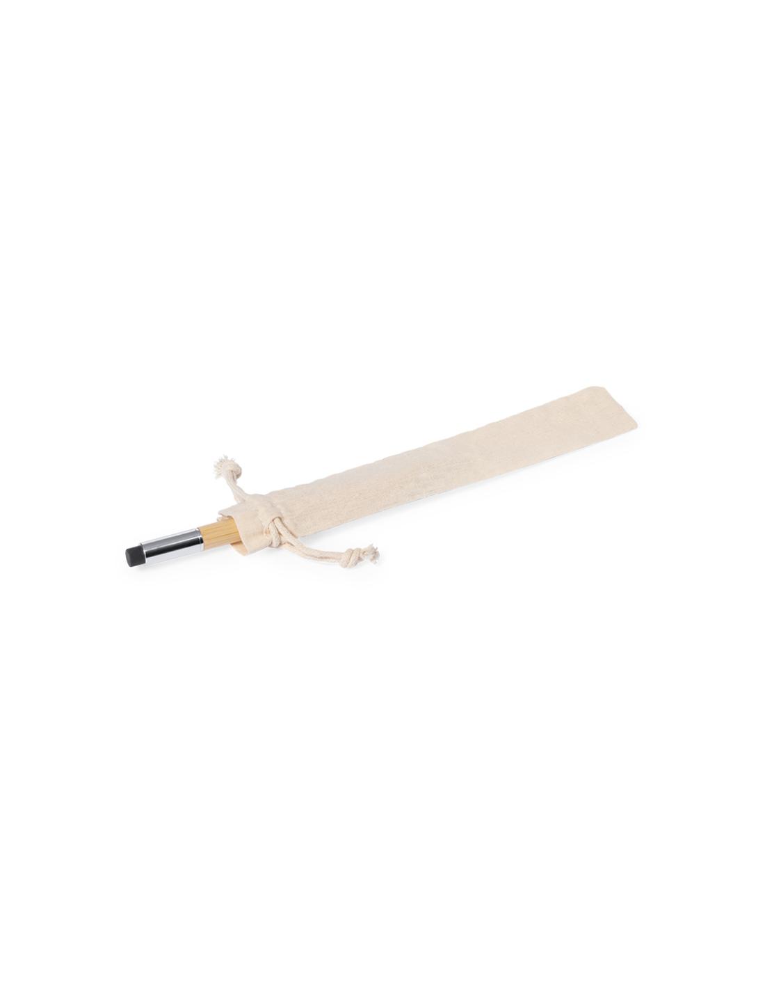 Bolígrafo lápiz eterno 2 en 1, fabricado en bambú, con cuerpo de suave acabado y accesorios cromados. Con cierre de capucha con borrador y puntero en cada extremo, incluye bolígrafo en un extremo (carga jumbo y tinta azul), y lápiz eterno en el otro extremo, para así usar siempre el mismo lápiz y no generar residuos. Presentado en funda de algodón 100%, con cordón de cierre.