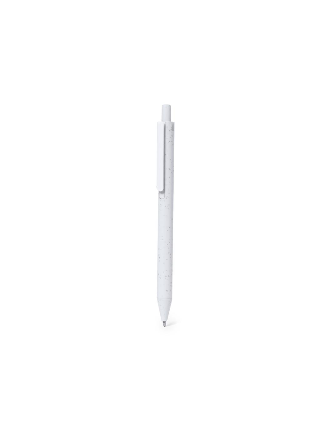 Bolígrafo de mecanismo pulsador fabricado en ABS reciclado. Con clip en vivos colores y cuerpo de suave acabado en color blanco sólido. Distintivo ABS reciclado en la parte superior del bolígrafo. En tinta azul.