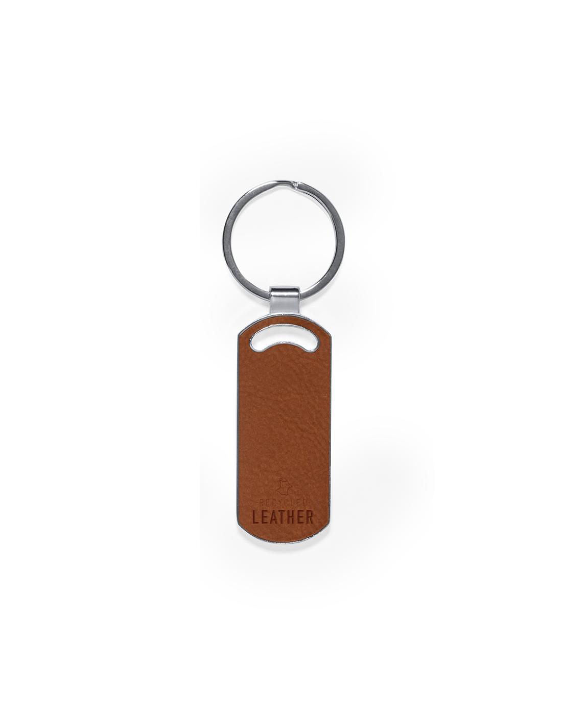 Llavero fabricado en cuero reciclado. En tono marrón, incluye distintivo cuero reciclado en una cara, con lado opuesto liso para impresión y anilla metálica cromada. Disponible en cuatro diseños:A: CasaB: CocheC: CírculoD: RectánguloPresentado en bolsa individual reciclada de cartón kraft.El cuero reciclado rescata las fibras desechadas en los procesos de fabricación del cuero, minimizando el desperdicio de material, contribuyendo a reducir el impacto ambiental y manteniendo a la vez sus propiedades originales.
