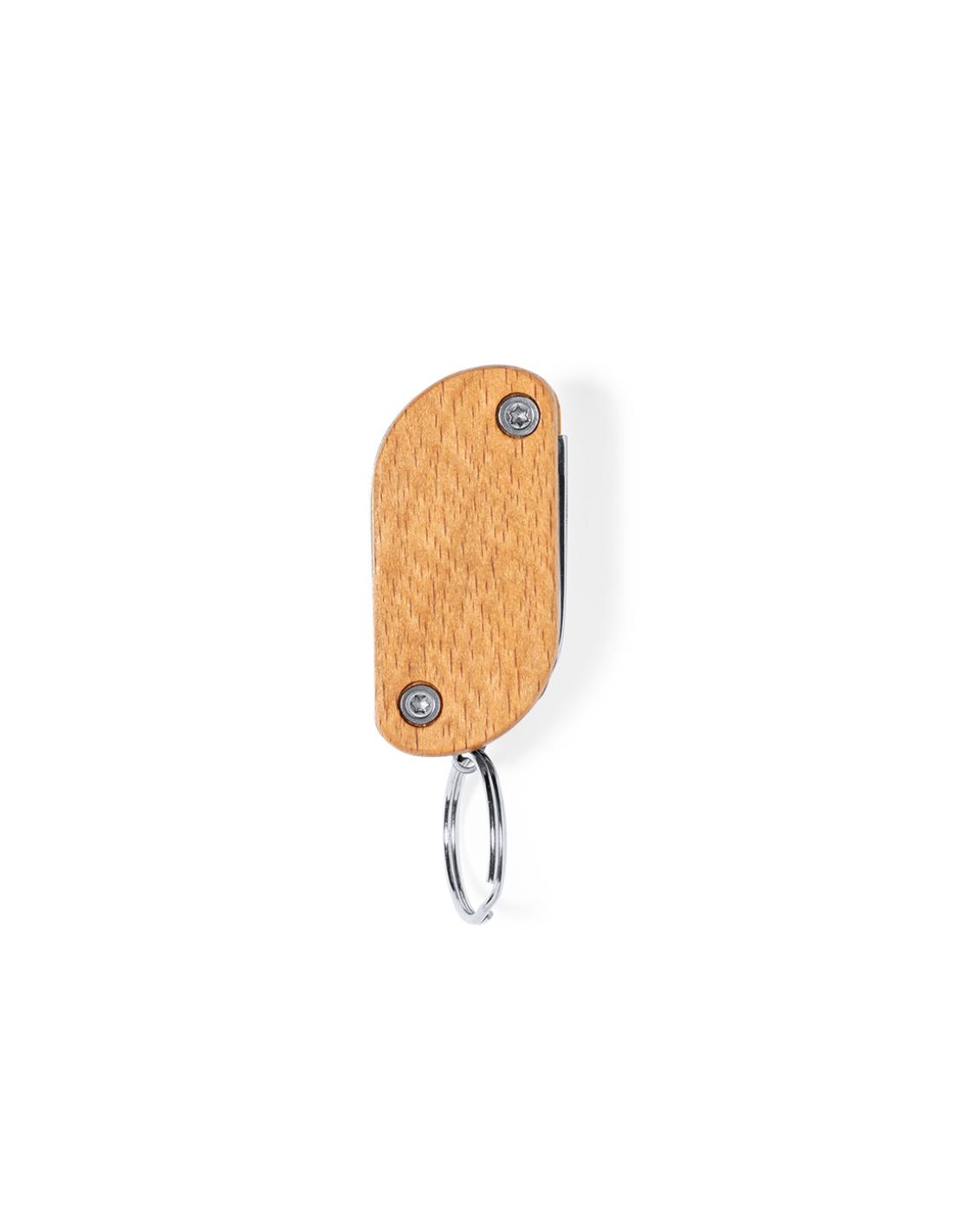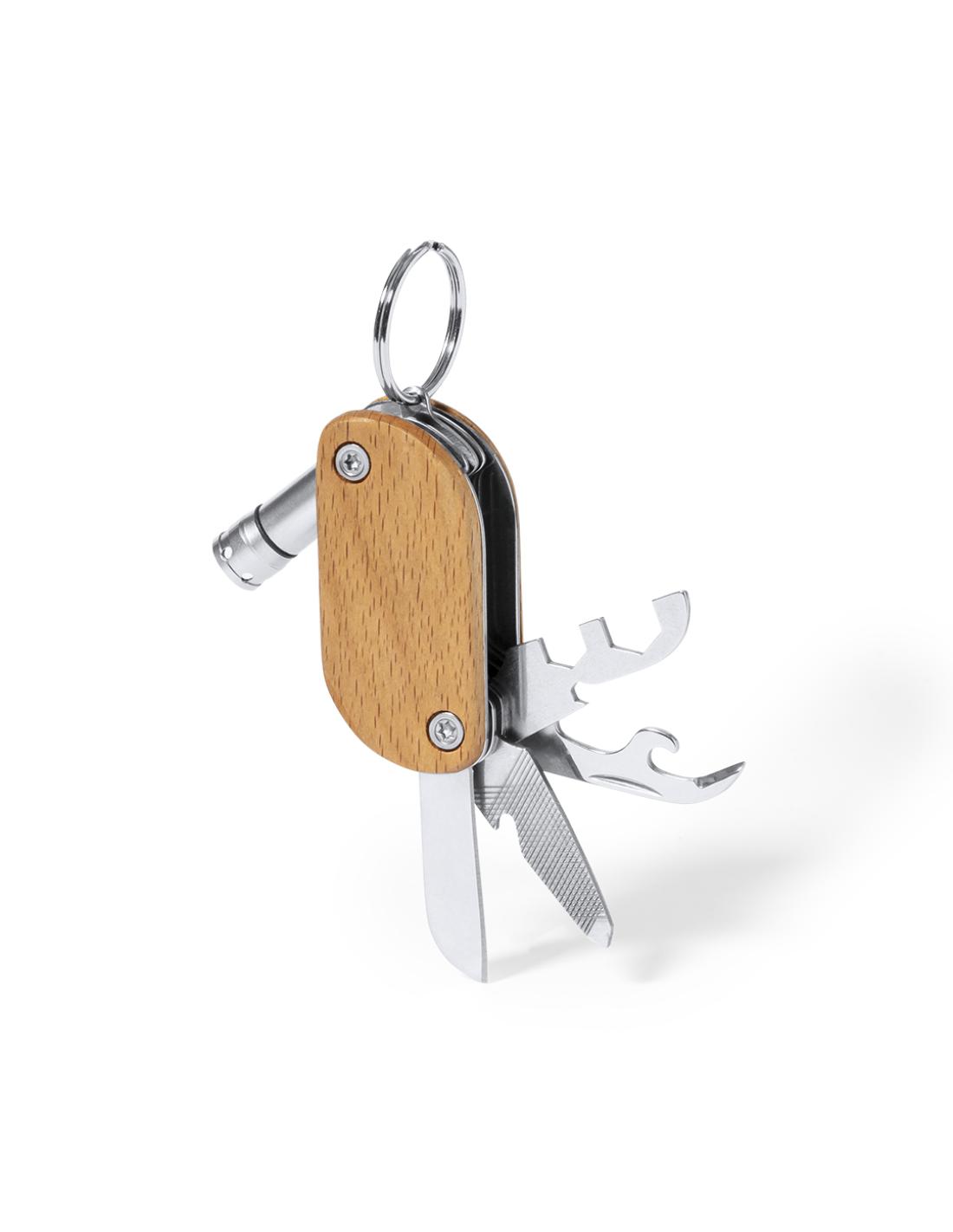 Práctico llavero multiherramienta fabricado en resistente acero inox y madera. Con 9 funciones: destornillador, abrebotellas, cuchillo, abrelatas, lima, distintas llaves y linterna de un led. Alimentación a pilas (3 pilas de botón incluidas) y presentado en caja individual de diseño kraft.