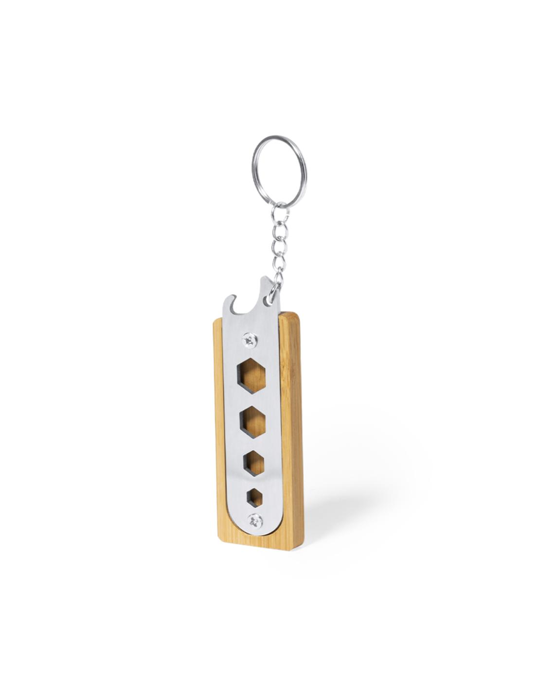 Llavero multiherramienta fabricado en resistente acero inox y bambú. Con práctico conjunto de 4 llaves fijas hexagonales troqueladas y abrebotellas. Presentado en caja individual de diseño kraft.