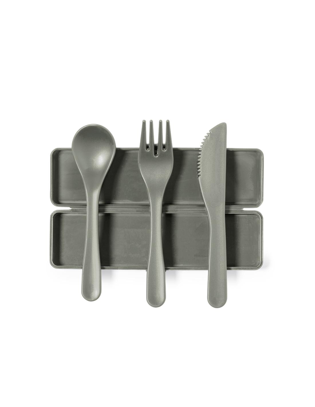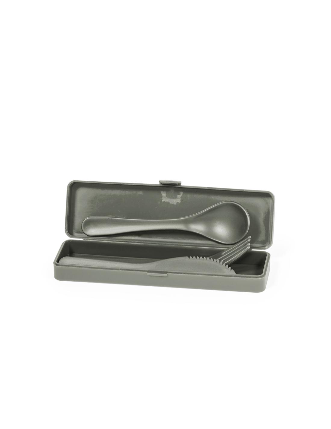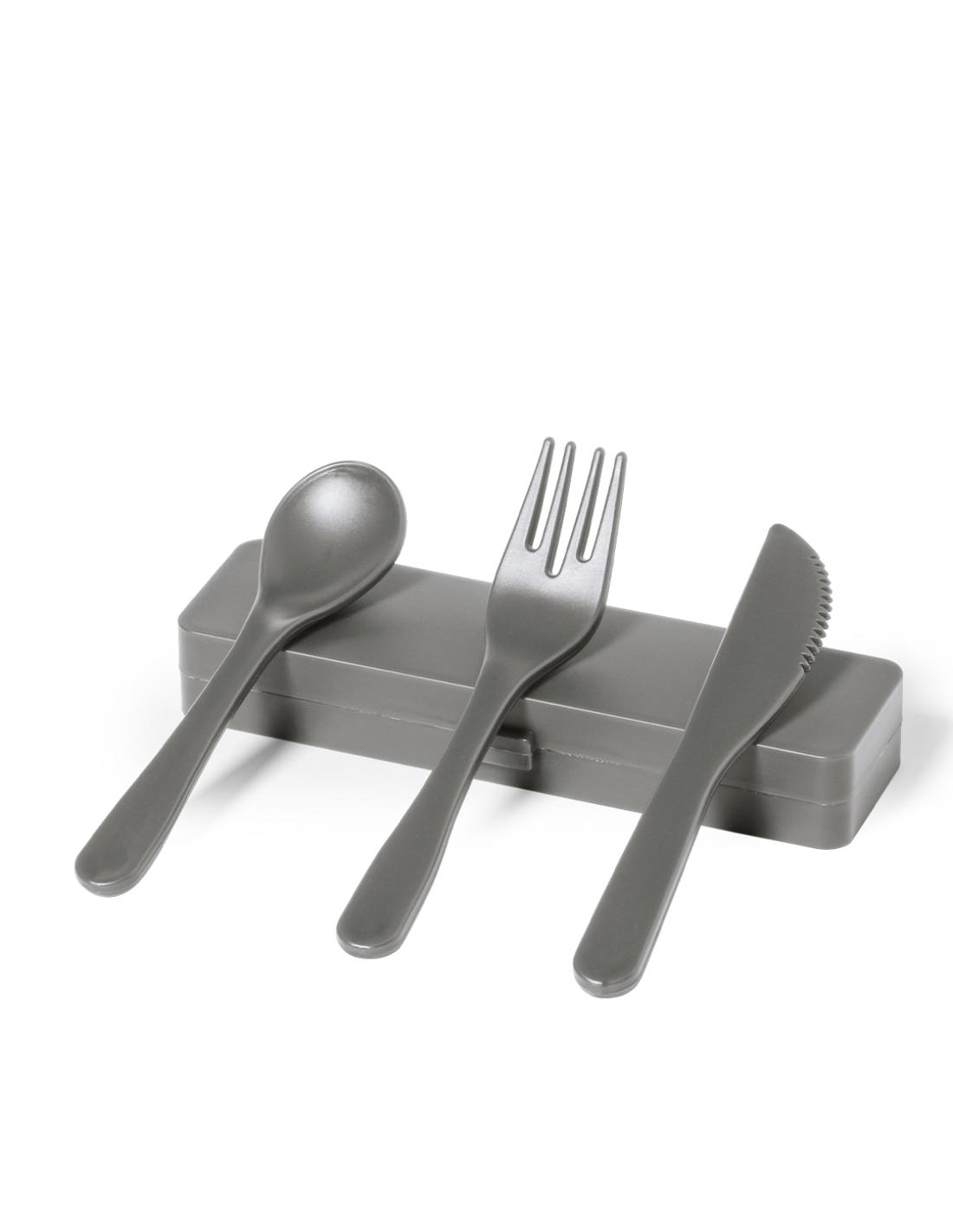 Set de cubiertos fabricados en PP reciclado libre de BPA, con estuche de presentación a juego. Incluye cuchara, tenedor y cuchillo. Dispone de Certificación Food Grade, garantizando la seguridad cuando los alimentos entran en contacto con el material usado para fabricar el producto. Estuche esterior y cubiertos en acabado mate disponibles en variada gamas de colores. Presentados en bolsa individual reciclada.El PP reciclado es un plástico reciclado y altamente reciclable, de gran resistencia y apto para multitud de aplicaciones.