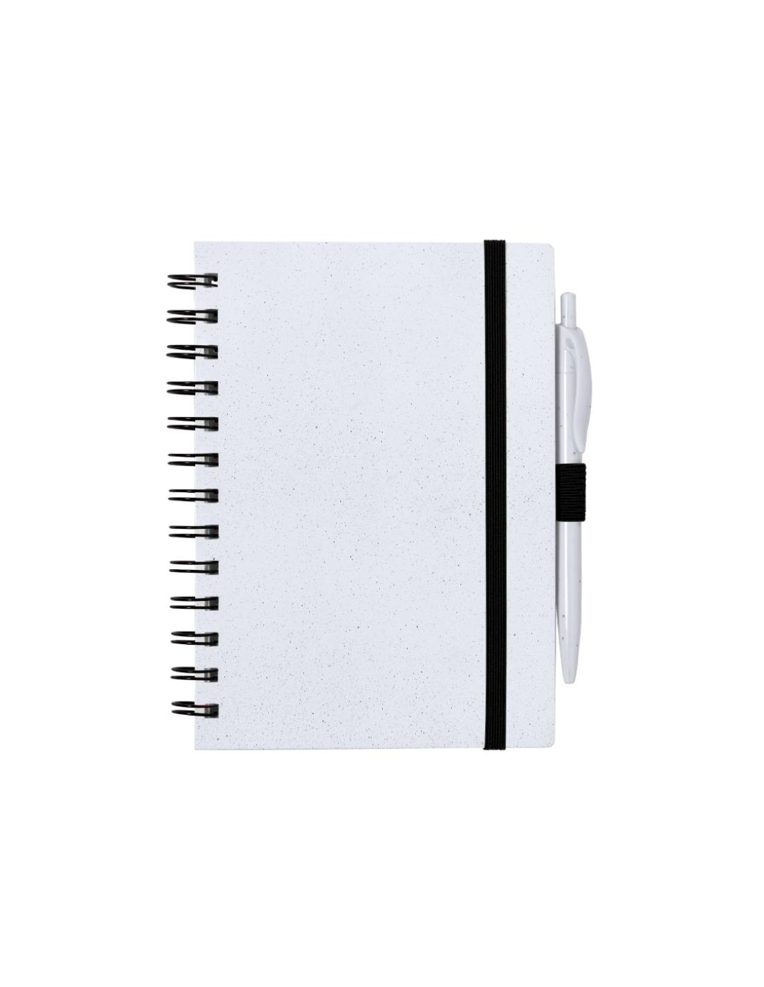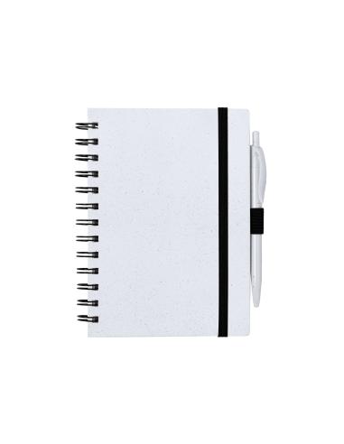 Set de libreta y bolígrafo. Libreta de anillas con tapas rígidas fabricadas en RABS y bolígrafo a juego. De tamaño A5, con elástico de cierre elegante disponible en amplia variedad de colores. Interior con 70 hojas blancas con disposición a una raya. Bolígrafo de mecanismo pulsador en RABS con tinta azul. Incluyen distintivo RABS. Presentado en bolsa individual reciclada.