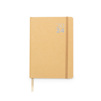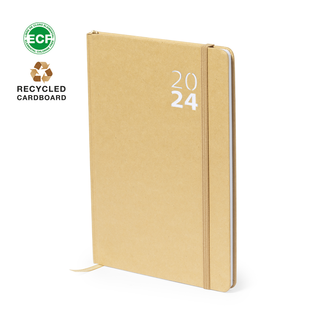 Agenda de tamaño A5 en cartón reciclado. Con cubiertas rígidas y elástico de cierre.Diseño semana vista, zona de anotaciones y marcapáginas de tela. En 2 idiomas: castellano e inglés. Presentada en caja kraft. El cartón reciclado proviene del reaprovechamiento de excedente de fabricaciones y reciclaje de papel en el final de su vida útil, convirtiéndose en un lienzo ecológico y sostenible.