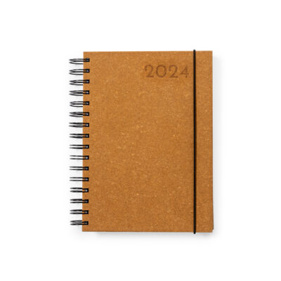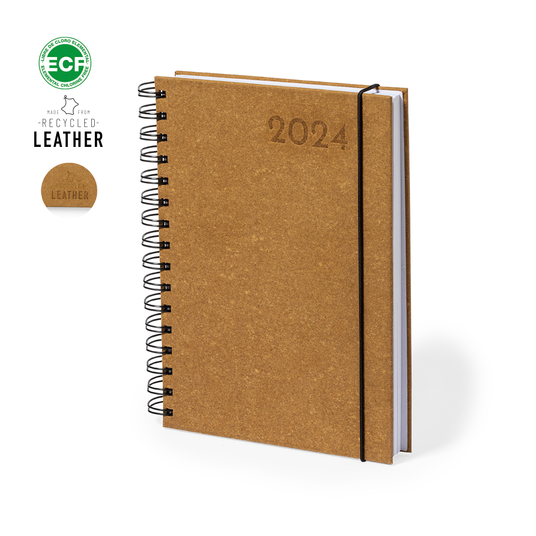 Agenda de tamaño A5 fabricada en elegante y sostenible cuero reciclado. Con cubiertas rígidas y elástico de cierre. Con distintivo cuero reciclado.Diseño página día, zona de anotaciones por día y páginas con esquina troquelada para marcar el día. En 2 idiomas: castellano e inglés. Presentado en caja kraft. El cuero reciclado rescata las fibras desechadas en los procesos de fabricación del cuero, minimizando el desperdicio de material, contribuyendo a reducir el impacto ambiental y manteniendo a la vez sus propiedades originales.