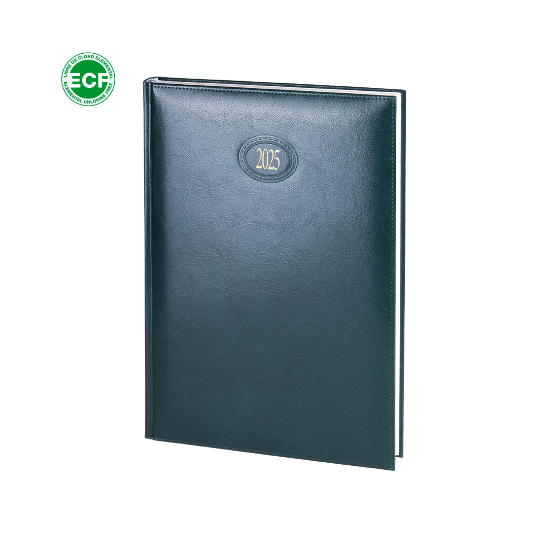 Agenda de tamaño B5 acabada en resistente y suave polipiel con acolchado. Con cubiertas rígidas, disponible en variada gama de colores. Diseño página día, con frase del día y marcapáginas de tela. En 8 idiomas: castellano, inglés, francés, italiano, portugués, gallego, euskera y catalán. Fabricada con papel libre de cloro elemental (ECF), que reduce de manera drástica la contaminación en el proceso de blanqueado de la pulpa del papel, consiguiendo una excelente calidad en el acabado final y, al mismo tiempo, garantizando el proceso de reciclado en múltiples ocasiones.