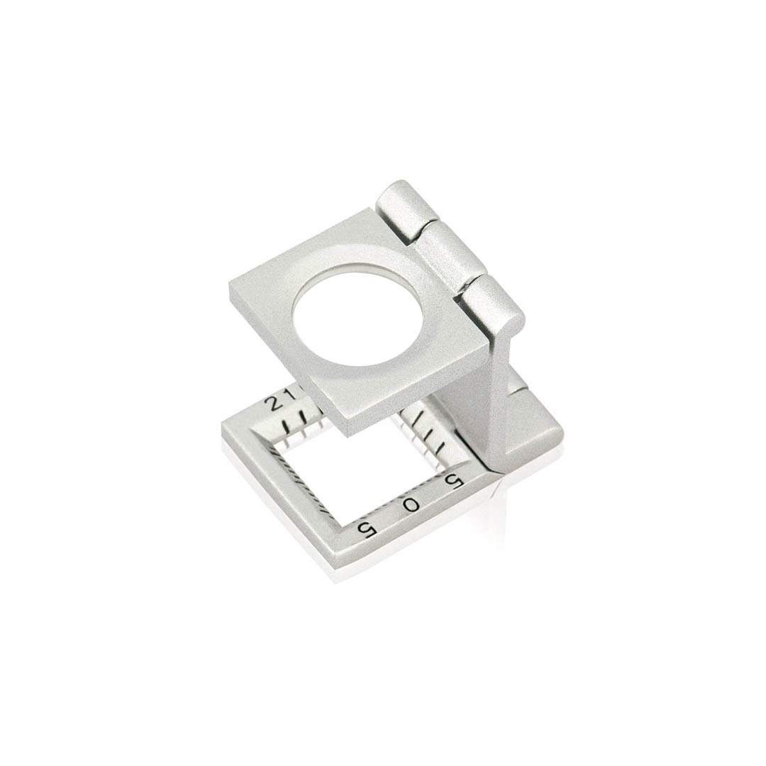 Lupa cuentahilos metálica y plegable de 10 aumentos. Con lente de cristal, regla de medición integrada en cuerpo y presentada en caja individual.