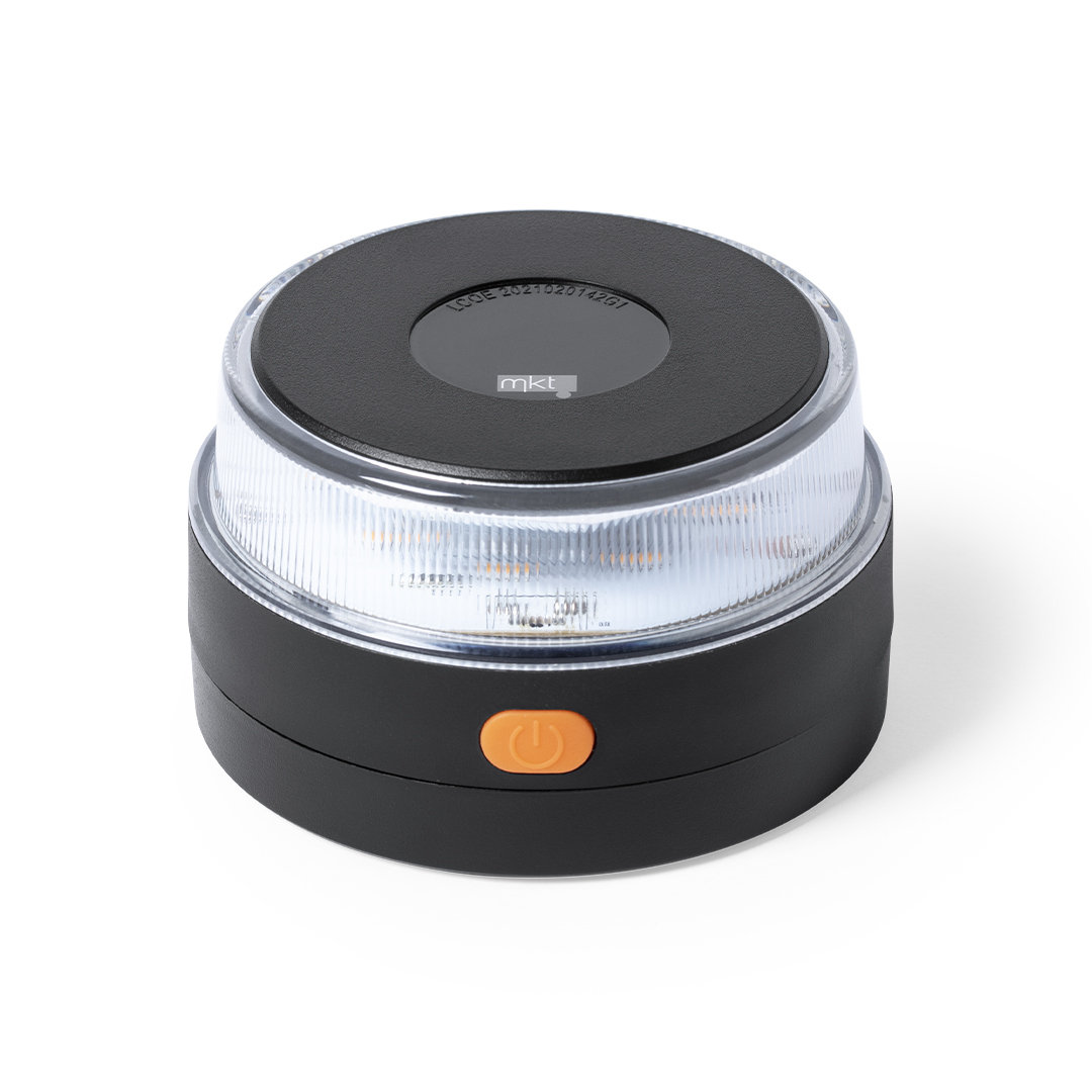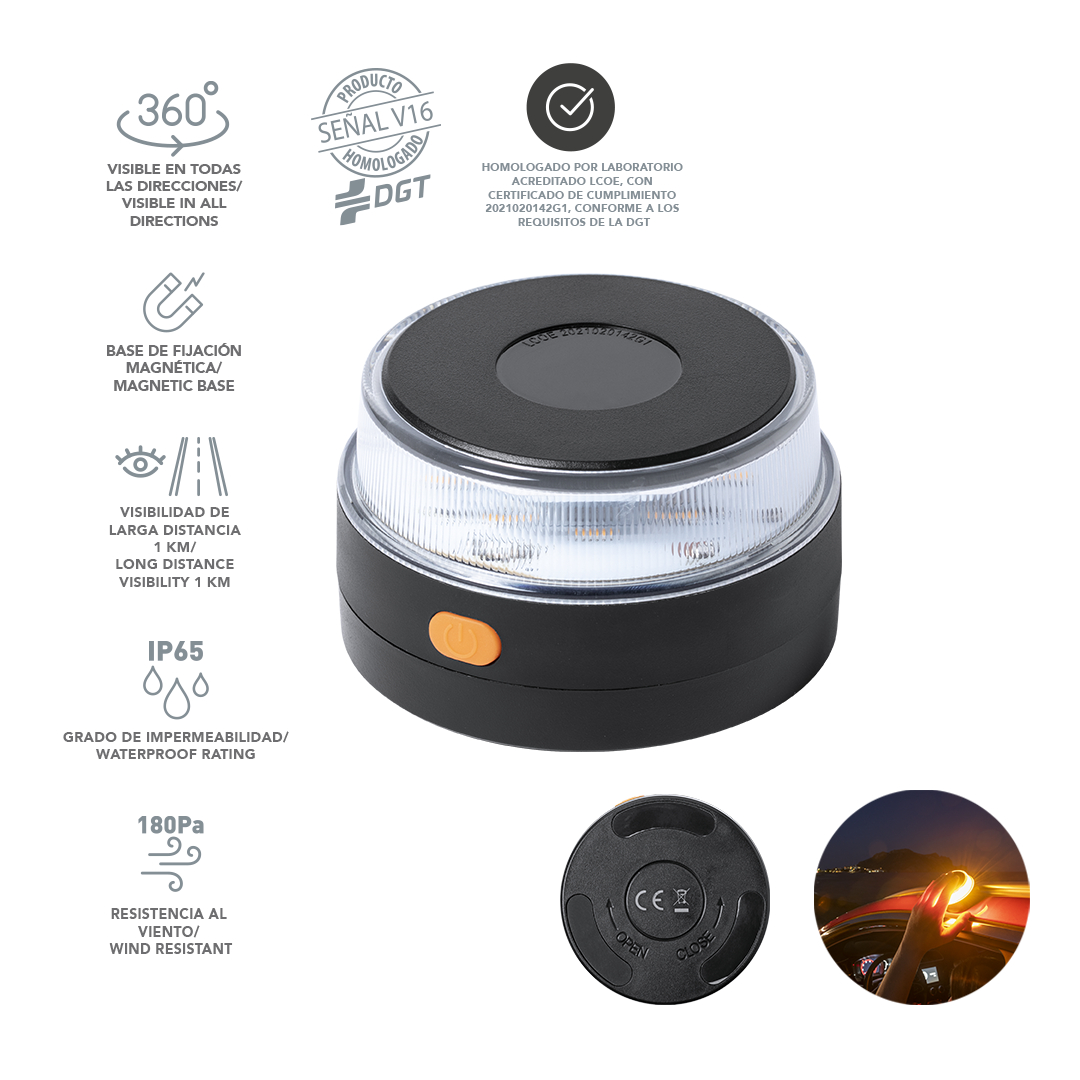 Luz de emergencia homologada V16 para vehículos. Fabricada conforme a la normativa de seguridad vigente y homologada por laboratorio acreditado LCOE, según requisitos de la DGT , con número de homologación marcado en la parte superior del artículo. De activación manual y con base de fijación magnética. Resistencia al viento de hasta 180Pa, visibilidad 360° -hasta 1 km de distancia- y resistencia al agua conforme a estándares IP65. De tamaño compacto para guardar en cualquier compartimento del vehículo y tenerla a mano en caso de emergencia. Presentada en caja individual de diseño. Manual incluido (español e inglés). Alimentación a pilas (3xAA pilas alcalinas incluidas). Banda lateral lisa para impresión. Certificado de Cumplimiento 2021020142G1 emitido por LCOE, conforme a los requisitos de la DGT.