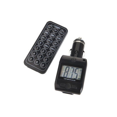 Reproductor de música MP3 para mechero de coche. Conexión a la radio del automóvil vía frecuencia FM. Pantalla LCD integrada, ranura para tarjeta SD y conexión de datos USB. Con mando a distancia multifunción y sistema de ajuste telescópico. Presentado en atractiva caja de diseño.