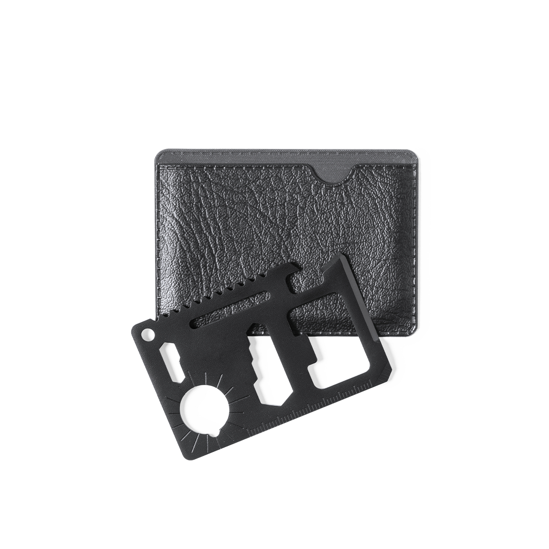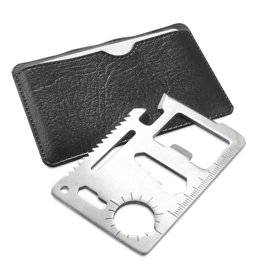 Multiherramienta con resistente cuerpo en acero inox con 11 funciones. Con funciones abrelatas, cuchillo, destornillador, regla, abrebotellas, llaves inglesas, llaves de mariposas, sierra e indicador de dirección. Presentada en resistente funda de polipiel.