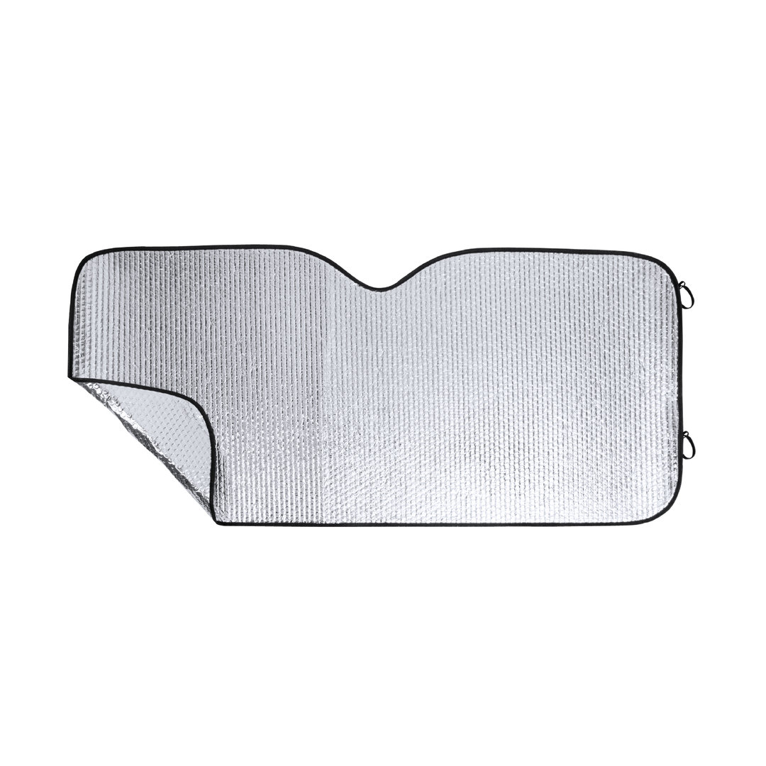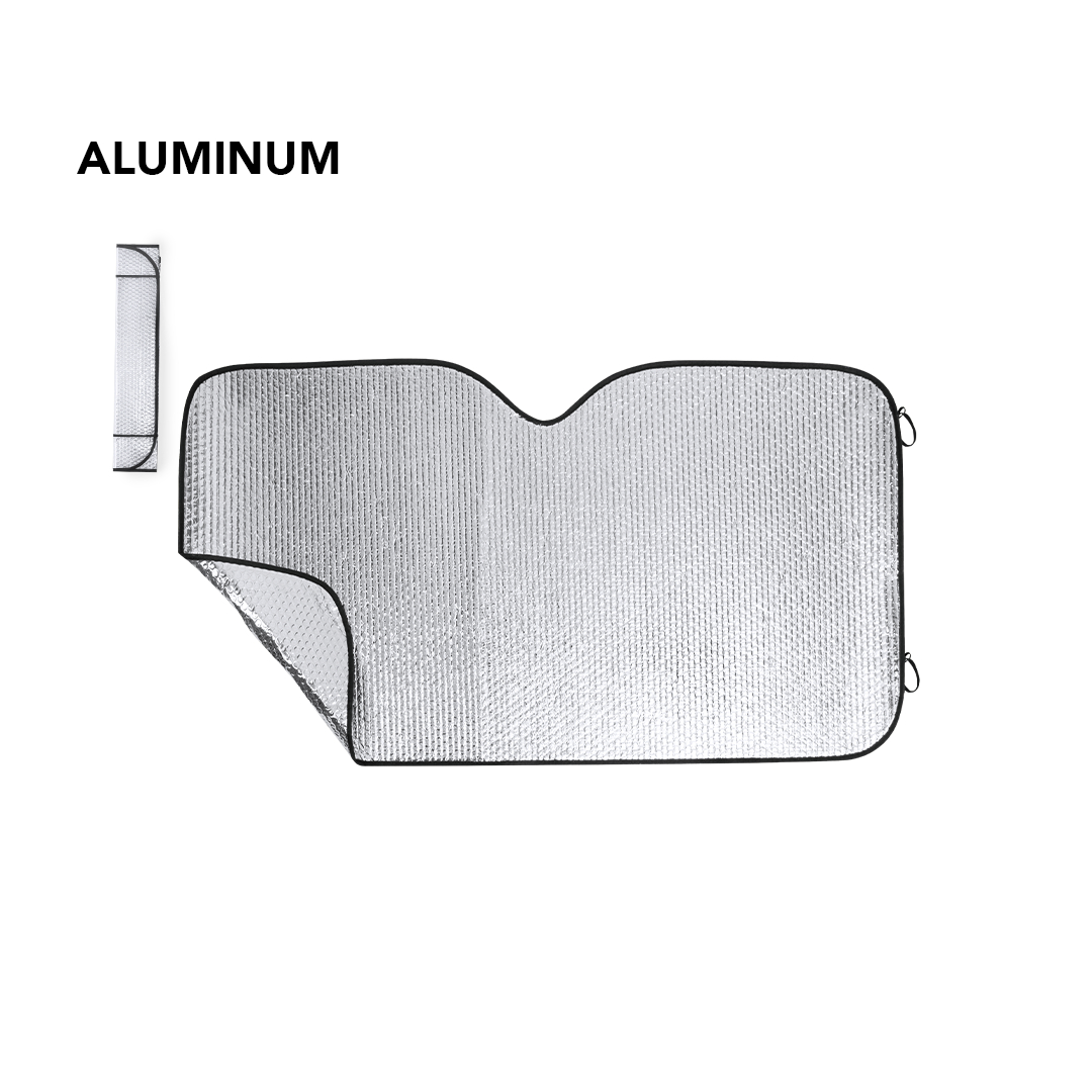 Parasol en aluminio con burbuja en ambas caras. Acabado plateado metalizado, con ribetes en color negro y en tamaño 130 x 70 cm. Con cintas elásticas para plegado y presentación desplegado en plancha para fácil impresión, con bolsas aparte.