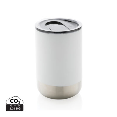 Este hermoso vaso cuenta con una construcción de acero inoxidable reciclado con aislamiento al vacío para mantener las bebidas calientes hasta 3 horas o frías hasta 6 horas. Su ejecución moderna con detalle inferior de acero inoxidable la convierte en un verdadero punto de atracción. La tapa con función de apertura deslizante garantiza una experiencia de beber antigoteo. Fabricado con materiales reciclados certificados RCS (Recycled Claim Standard). La certificación RCS garantiza una cadena de suministro completamente certificada de los materiales reciclados. Contenido reciclado total: 76% basado en el peso total del artículo. Sin BPA. Capacidad 360ml. Incluye embalaje kraft certificado FSC®.