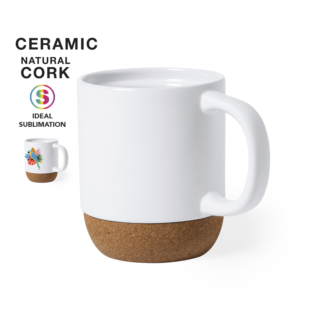 Taza de cerámica de 420 ml de capacidad, especialmente diseñada para marcaje en sublimación. De acabado mate, con base en corcho natural y presentada en caja individual de diseño kraft.